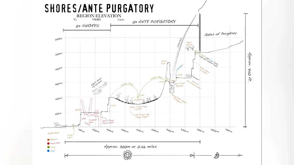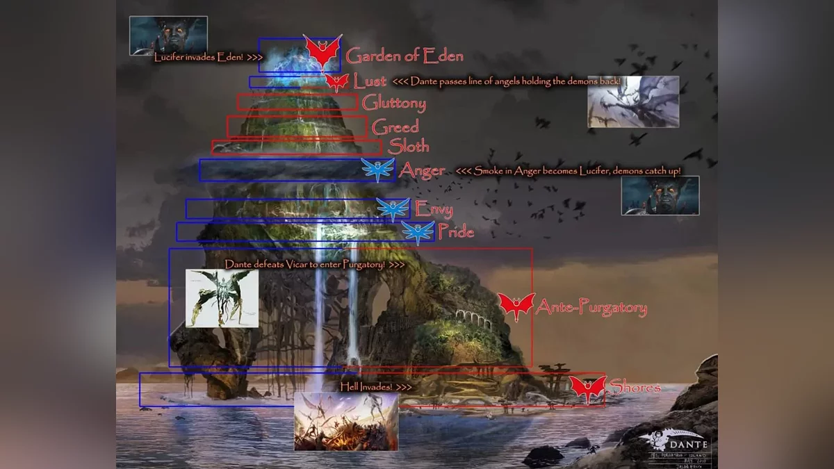 - Гра починалася в Саду Едему та охоплювала подорож Данте по Горі Чистилища, включаючи нові рівні Раю та Ада;