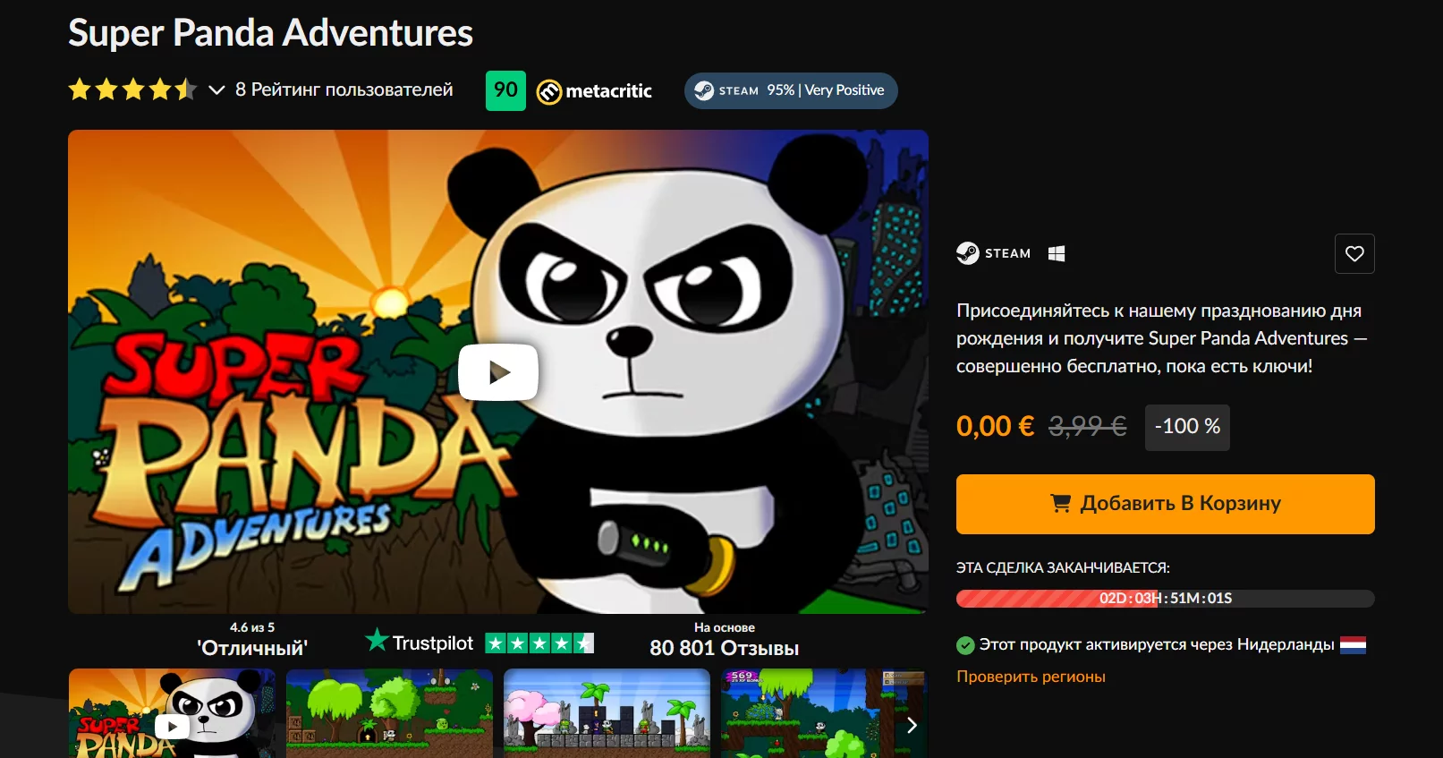 - Додати Super Panda Adventures в кошик і оформити замовлення. Після цього можна отримати ключ гри для активації в Steam.
