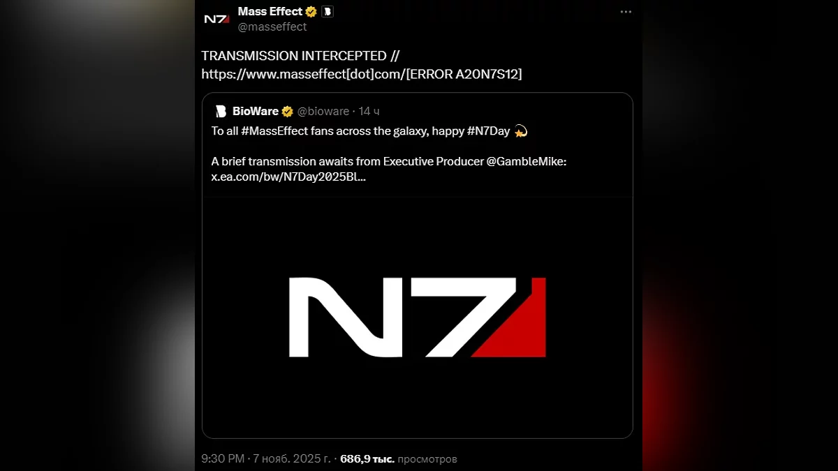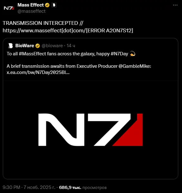 Поклонники Mass Effect отримали приємний, хоч і невеликий сюрприз від BioWare до нової річниці N7 Day. Розробники залишили зашифроване послання, яке привело гравців до концепт-арту п'ятої частини.