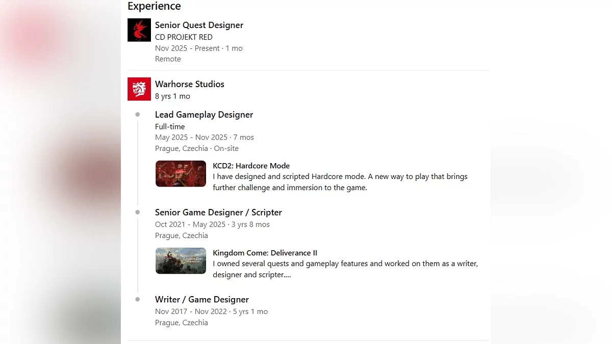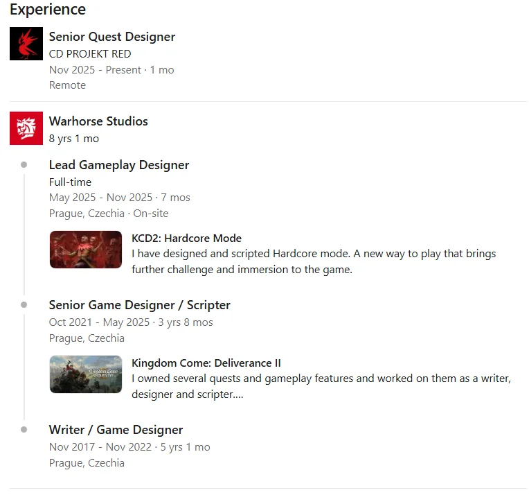 Про своє приєднання до CDPR Карел Кольман (Karel Kolmann) повідомив у особистому профілі LinkedIn. Судячи з резюме спеціаліста, раніше в Warhorse він працював на позиції сценариста та старшого геймдизайнера KCD 2, а також керував розробкою хардкорного режиму для історичної RPG. Тепер Кольман буде працювати в якості старшого дизайнера квестів у CD Projekt RED.