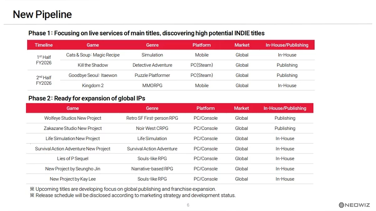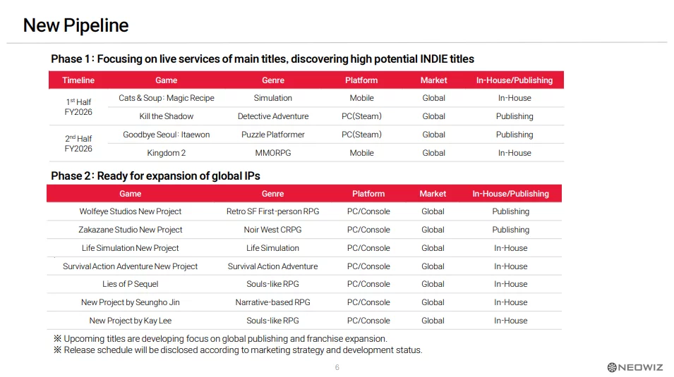 Neowiz зазначає, що всі нові проекти орієнтовані на глобальну публікацію та розширення франшиз. Дати релізів будуть оголошені залежно від маркетингової стратегії та стану розробки.