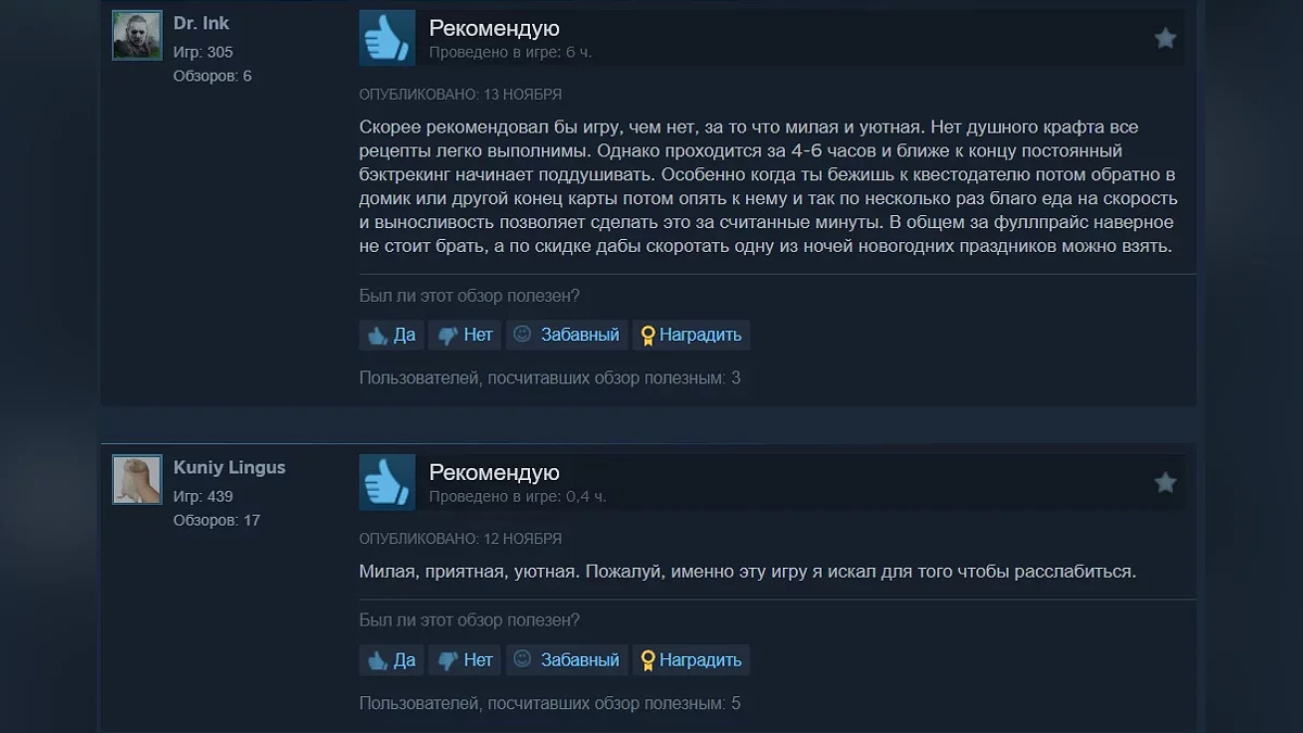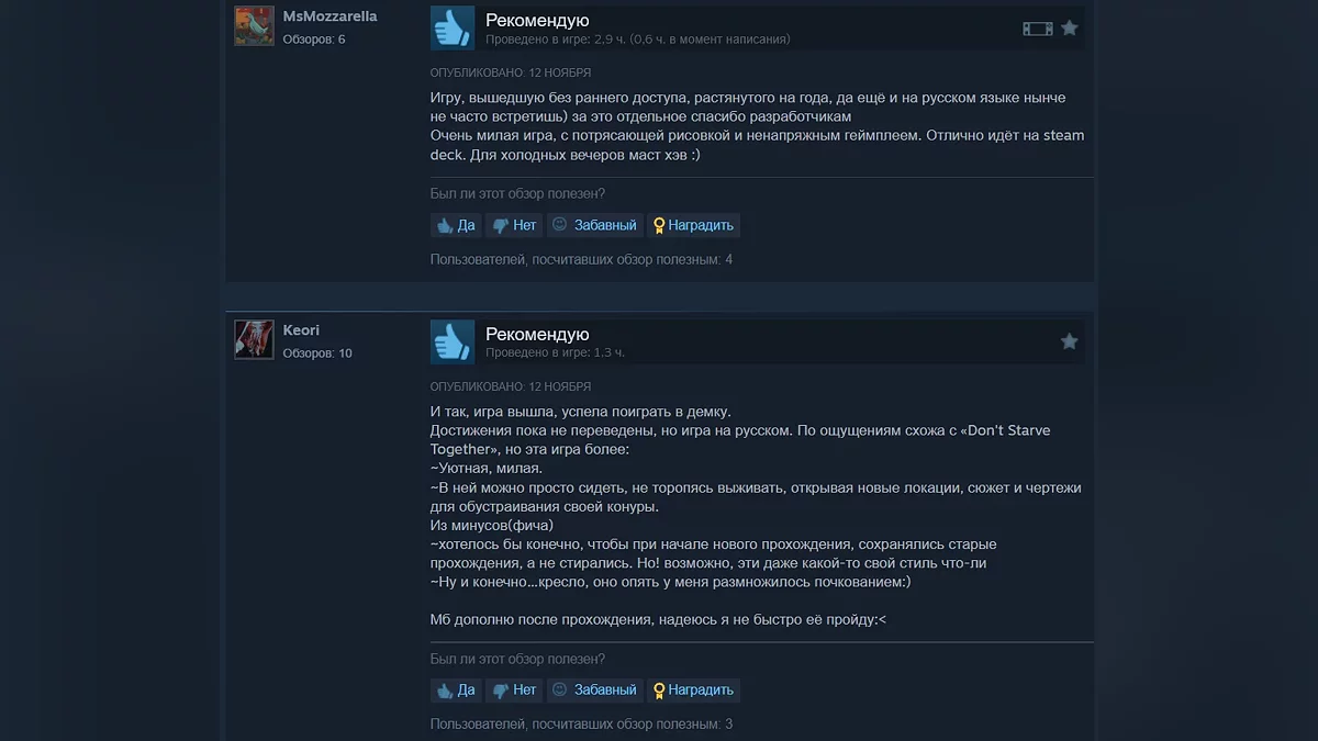 Серед плюсів виділяють милий візуальний стиль і розслабляючий геймплей. До мінусів частина гравців відносить занадто малу тривалість проходження.