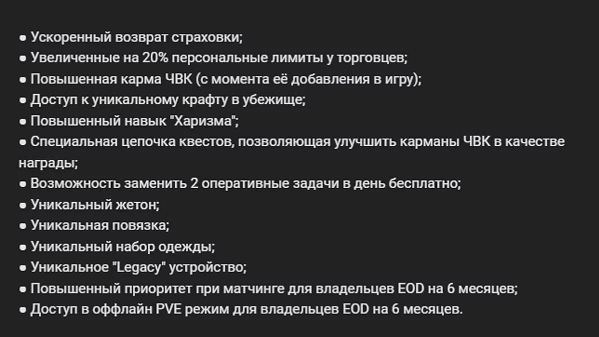 Перечень бонусов для издания Edge of Darkness разработчики привели в соцсетях. Так, его владельцы получат увеличение лимитов у торговцев, повышенную карму ЧВК, уникальный крафт в убежище, уникальные жетон, одежду, повязку и «Legacy» устройство, а также повышенный приоритет в матчинге на полгода.