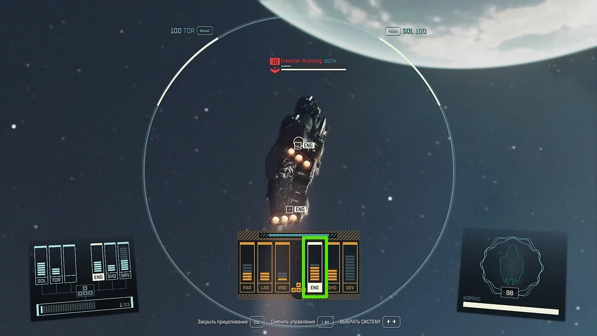 Чтобы вывести из строя двигатели, необходимо навестись на цель (кнопка «E»), затем дождаться фиксации и нажать клавишу «R». Вы перейдёте в режим прицеливания, где отображены все части звездолёта. Выберите двигатель (ENG) и произведите несколько выстрелов. В зависимости от типа и уровня корабля, вы можете быстро избавиться от этой части судна, но сперва также придётся разрушить щит вражеского летательного аппарата.