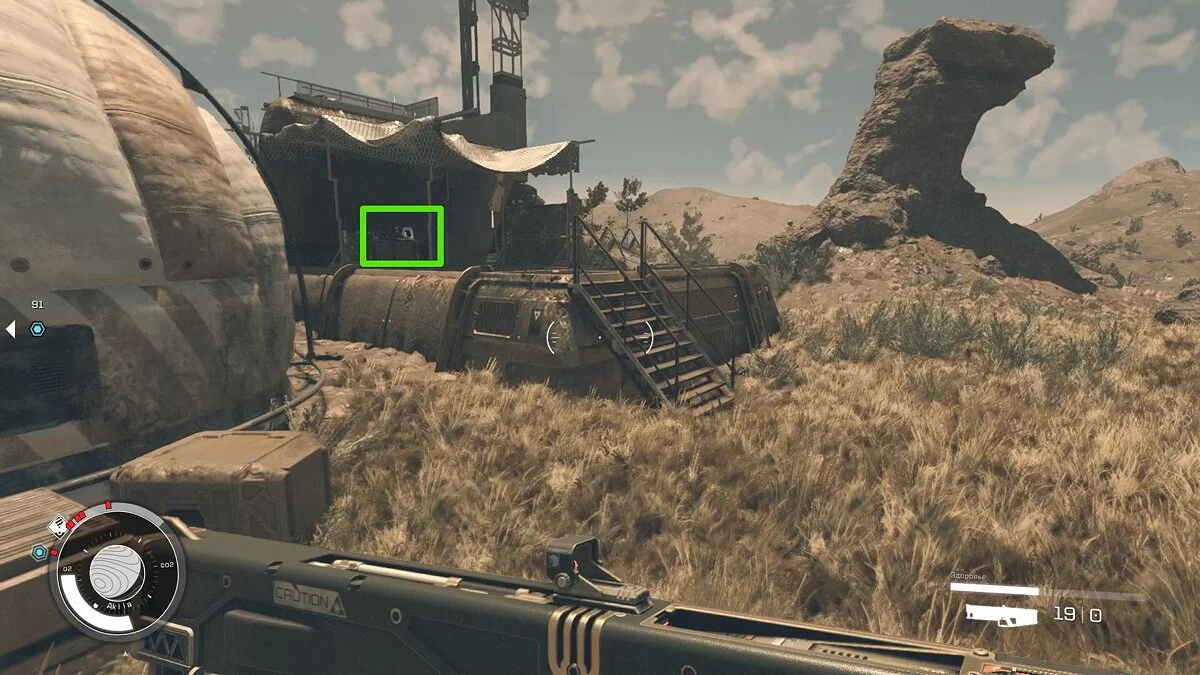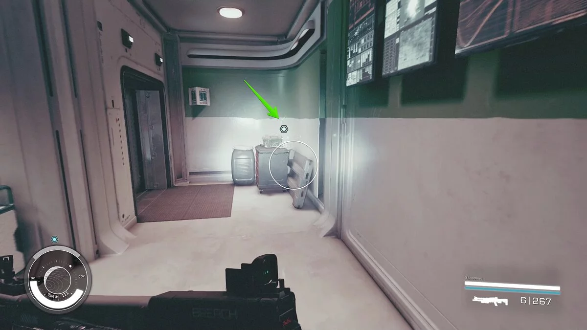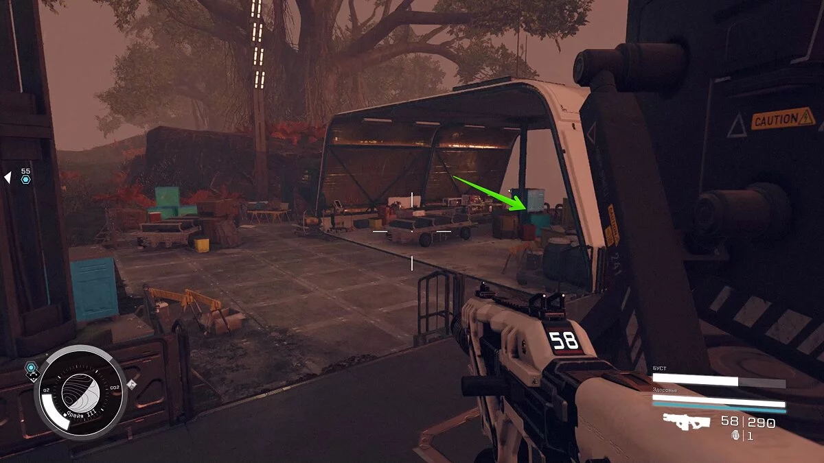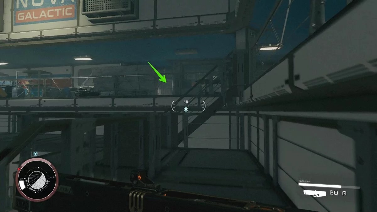 Совершите посадку в точке «Исследовательская станция Nishina» и бегите за маркером. Перед входом в комплекс есть открытый ангар — осмотрите его, чтобы найти неплохой шестизарядный дробовик. Он пригодится на первых порах, а позднее можно будет получить более мощную пушку от охранника станции.