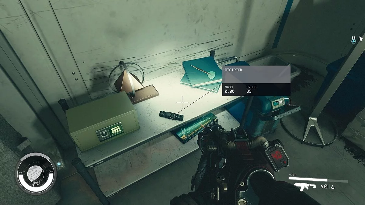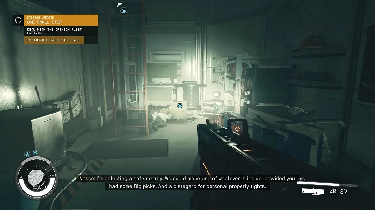 Направляйтесь в лабораторию. По пути осматривайте трупы и подбирайте ценные предметы. Следуя за маркером вы наткнётесь на группу пиратов — перебейте их. В длинном коридоре откройте первую дверь слева и зайдите в дальнюю комнату. Здесь есть сейф, рядом с которым лежит цифровая отмычка (digitpick). Это один из первых замков в игре, который вы можете вскрыть прямо сейчас. Если вы ещё не изучили механику взлома, обязательно прочтите этот гайд.