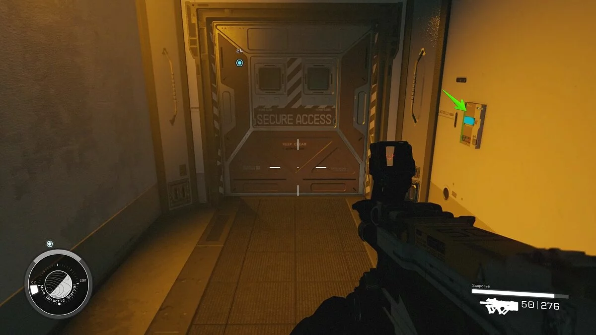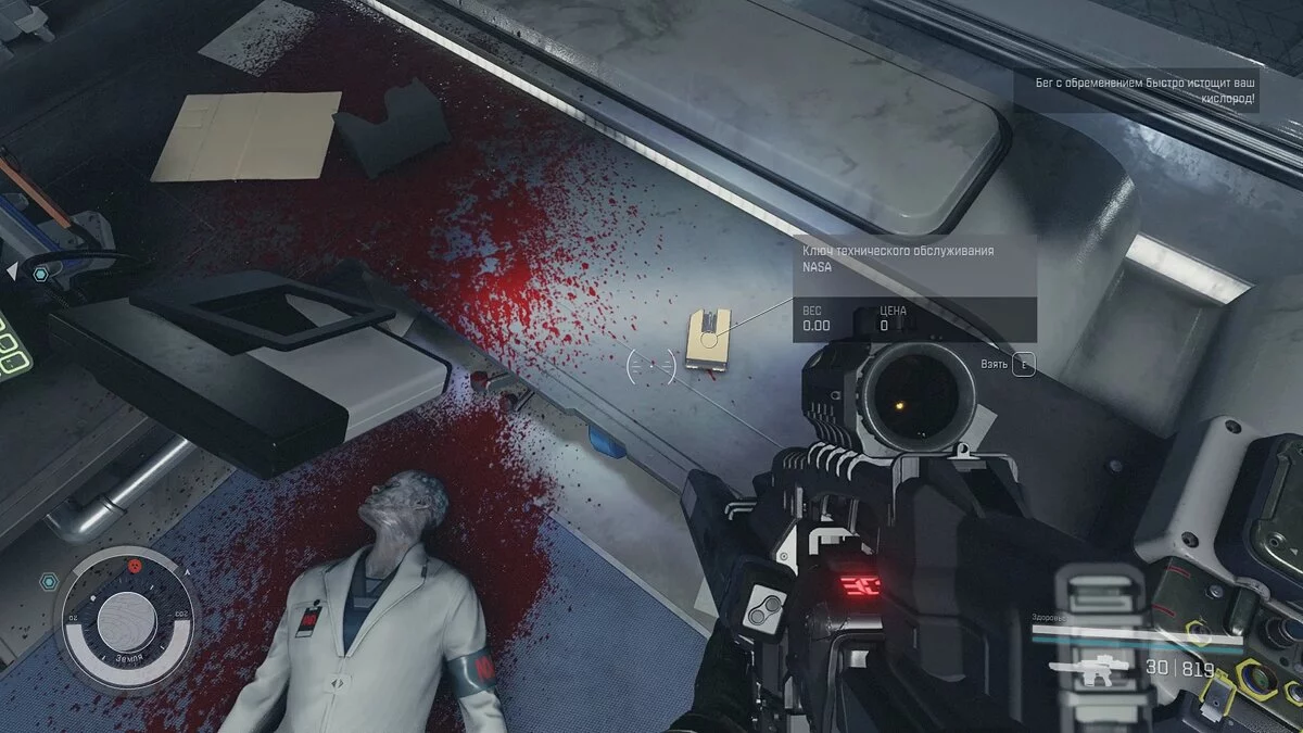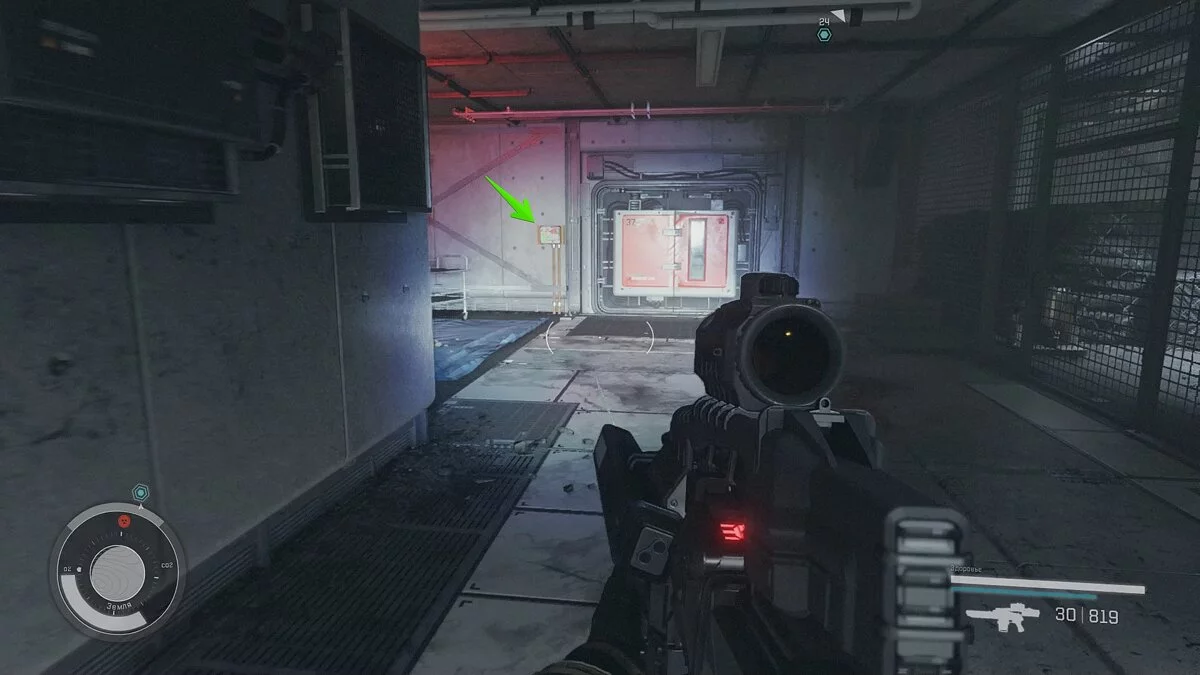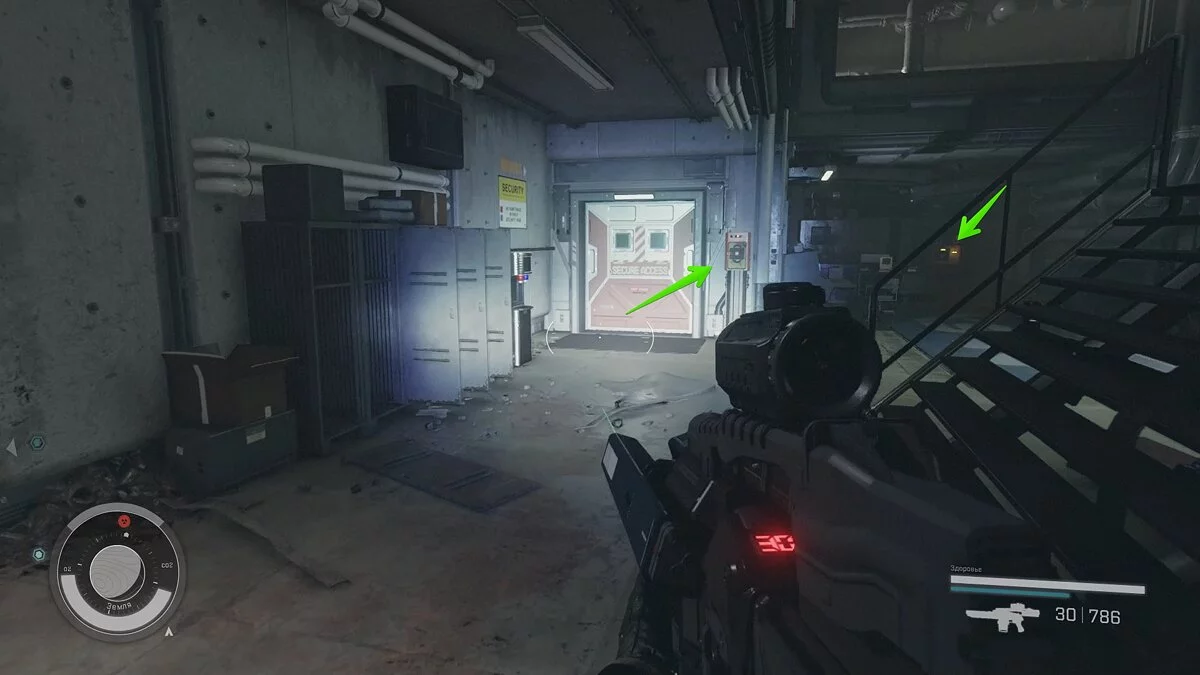 Продолжайте бежать от маркера к маркеру, пока не окажетесь у очередного терминала. Здесь будет развилка — можете спуститься на один уровень вниз по шахте лифта и подобрать ключ-карту на столе в коридоре или пройти по лестничной клетке и получить такую же карту, но с трупа.
