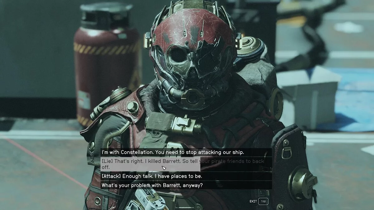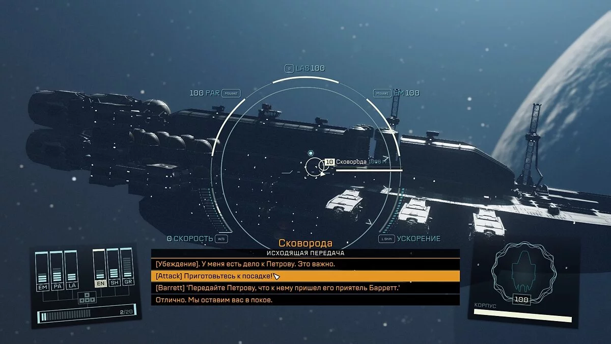 Выбравшись на поверхность, вы встретитесь с главарем пиратов. Можете солгать ему, чтобы избежать сражения. Однако мы не стали делать этого и перебили отряд. Когда сражение закончится, используйте сканер, чтобы быстро переместиться на свой корабль. Подробнее о механиках быстрого перемещения в игре мы рассказали здесь.