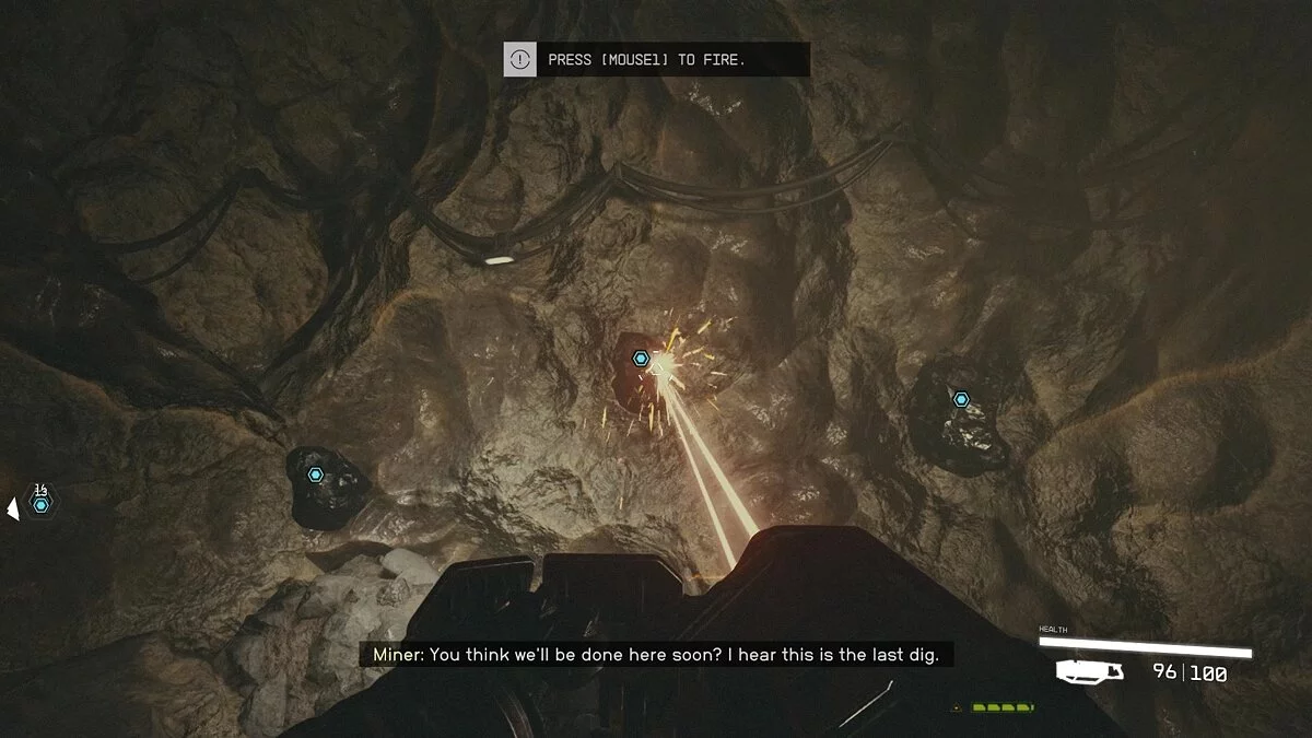 После вступительного ролика следуйте за супервайзером Лин и возьмите из ящика резак (cutter). С его помощью добудьте несколько минералов в соседней штольне. Для этого просто подойдите поближе, зажмите кнопку атаки и наведите луч на залежи ресурсов.