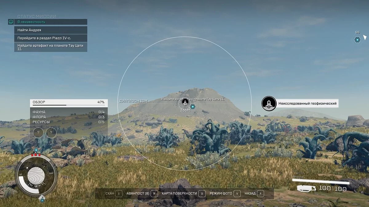 Переместитесь на Тау Цети и бегите за помехами сканера. Открыв устройство, вы также можете отследить неисследованный геофизический объект — бегите к нему. Вы окажетесь у входа в пещеру.