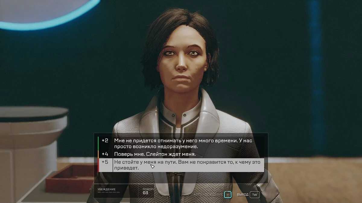 На выходе вас встретит Шоу вместе со своей бандой. Можете использовать убеждение, заплатить 4000 кредитов или убить их. Если выберите первый вариант, используйте следующие ответы: