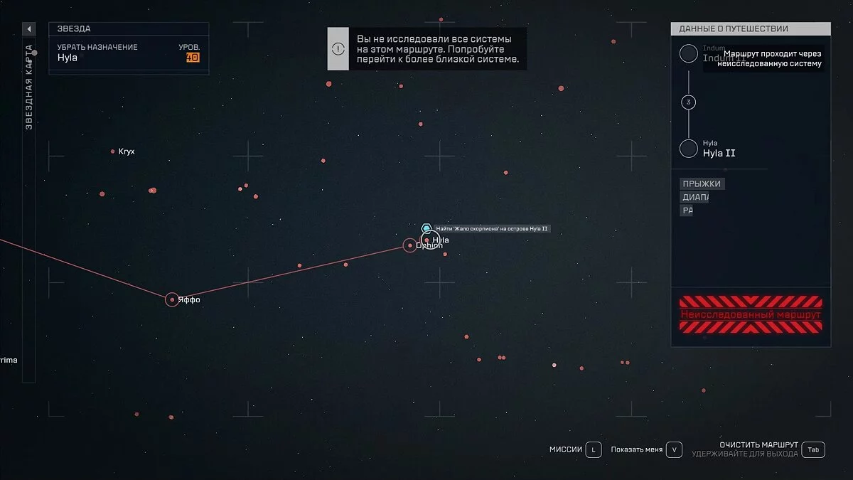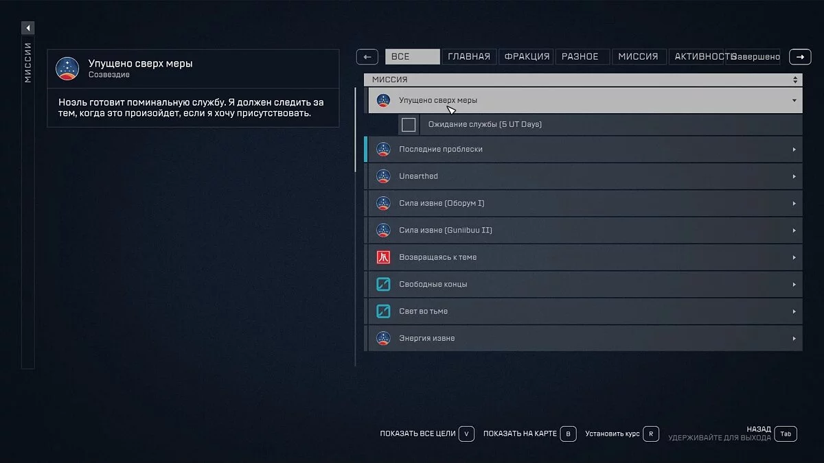 Совет: чтобы отследить цель задания на карте, откройте журнал задач (L), наведите курсор мыши на название квеста и нажмите «B». В этот момент откроется карта, а вы сможете совершить прыжок или задать курс для корабля (в зависимости от расстояния до планеты или объекта, к которому совершается перемещение).