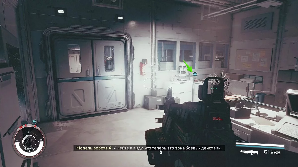Используйте искажение и пройдите в дальнюю правую комнату. Здесь будет ещё одна аномалия — вернитесь в мир до аварии. Так вы сможете подобрать на столе ключ-карту от дверей на верхнем уровне. Однако здесь же появятся роботы и несколько турелей.