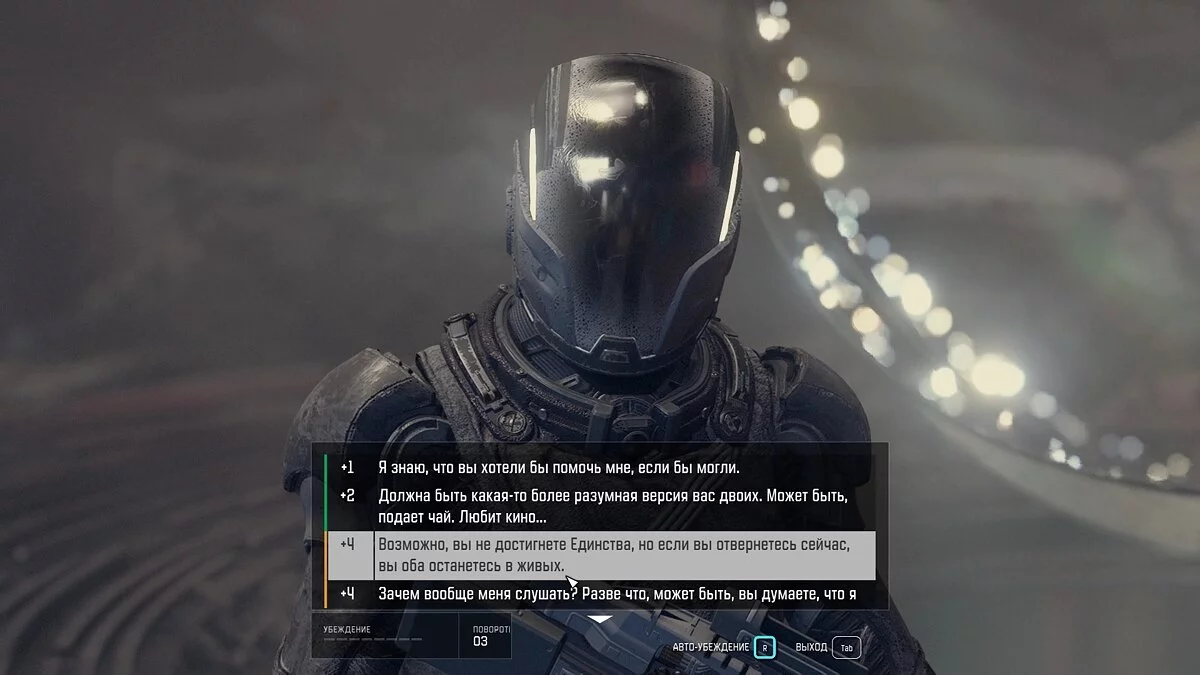 Сделав это, войдите в храм. Как обычно, придётся побеседовать с Охотником и Эмиссаром. Чтобы избежать перестрелки, можете воспользоваться убеждением. Для этого выберите «[Вмешаться] Прекратите это. Вы оба! Вся эта борьба в Населенных системах. Этому должен быть конец». Если удастся пройти проверку, то приятели отдадут вам свои артефакты, а вы сможете забрать последний и завершить игру.