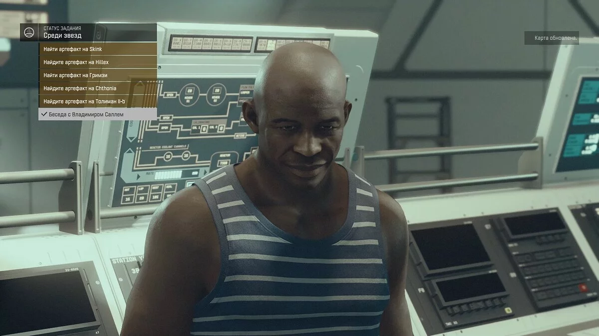 Вернитесь в штаб-квартиру «Созвездия» и положите найденные артефакты на стол. После непродолжительной беседы с приятелями, задание обновится. Снова отправляйтесь на спутник «Глаз» и выслушайте Владимира.