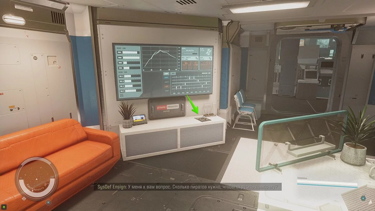 - Осмотрите комнату корабельного техника и планшет.