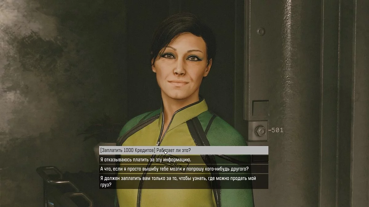 Пообщайтесь с торговым представителем и попытайтесь продать ей товар. Заплатите 1000 кредитов и вернитесь к столику, где подобрали доказательство. Согласитесь пройти проверку и спуститесь в нижнюю часть города.