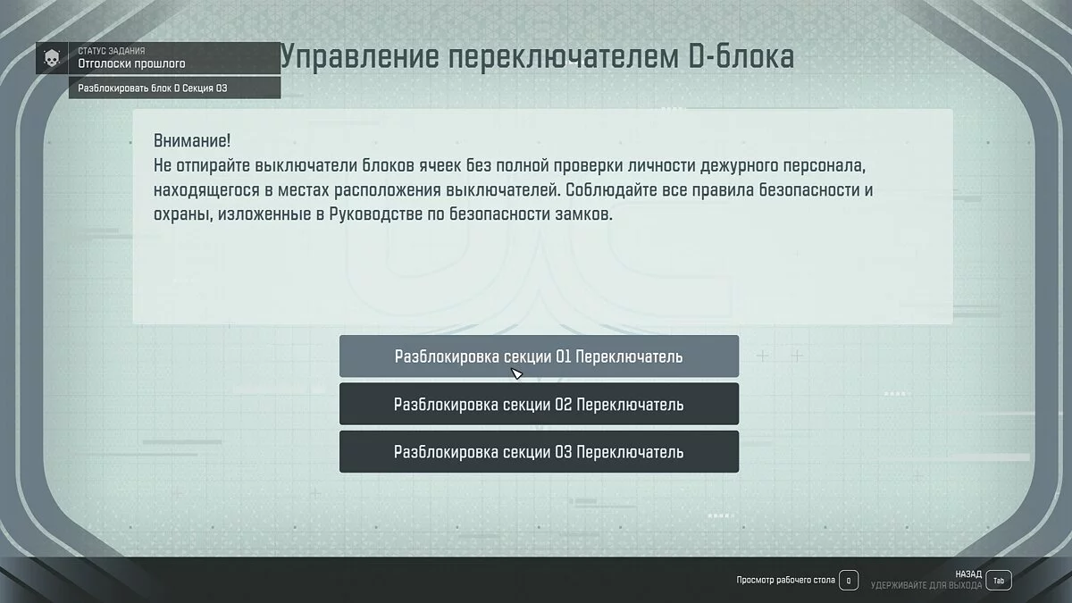 - Отголоски прошлого (2). Здесь доступно несколько доказательств. Одно находится в шкафчике Картера, в душевой секции блока D3. Второе в лампе запертой камеры в секции D1 или в кабинете смотрителя на столе.