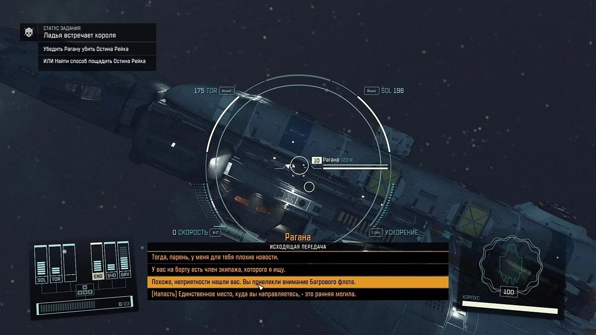 Совершите прыжок в указанную область и возьмите задание. Вам нужно будет убить одного из членов экипажа звездолёта «Регана». При подлёте с вами свяжется капитан корабля, а вы сможете принять решение: