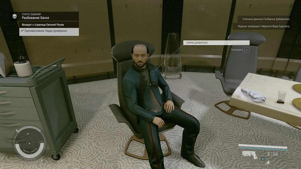 Бегите в каюту Габриэля и уговорите его поделиться информацией. Советуем заплатить 2500 кредитов и сразу отправиться к Думброски. Как мы уже отметили, убивать последнего не стоит. Просто обменяйте журнал операций Габриэля на учётные данные ГалБанка и покиньте судно.