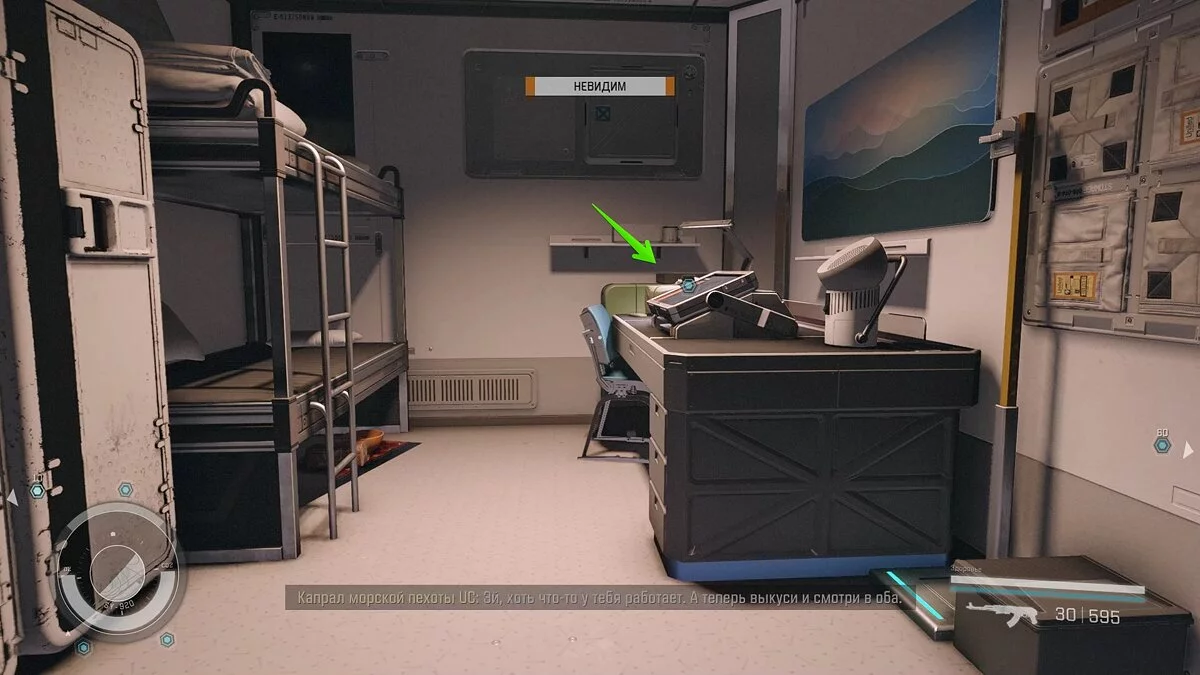 Пройдите по вентиляционной шахте до каюты капрала и заберите униформу на столе. Экипируйте её, снимите скафандр и отправляйтесь за маркером. Теперь можно не прятаться от экипажа.