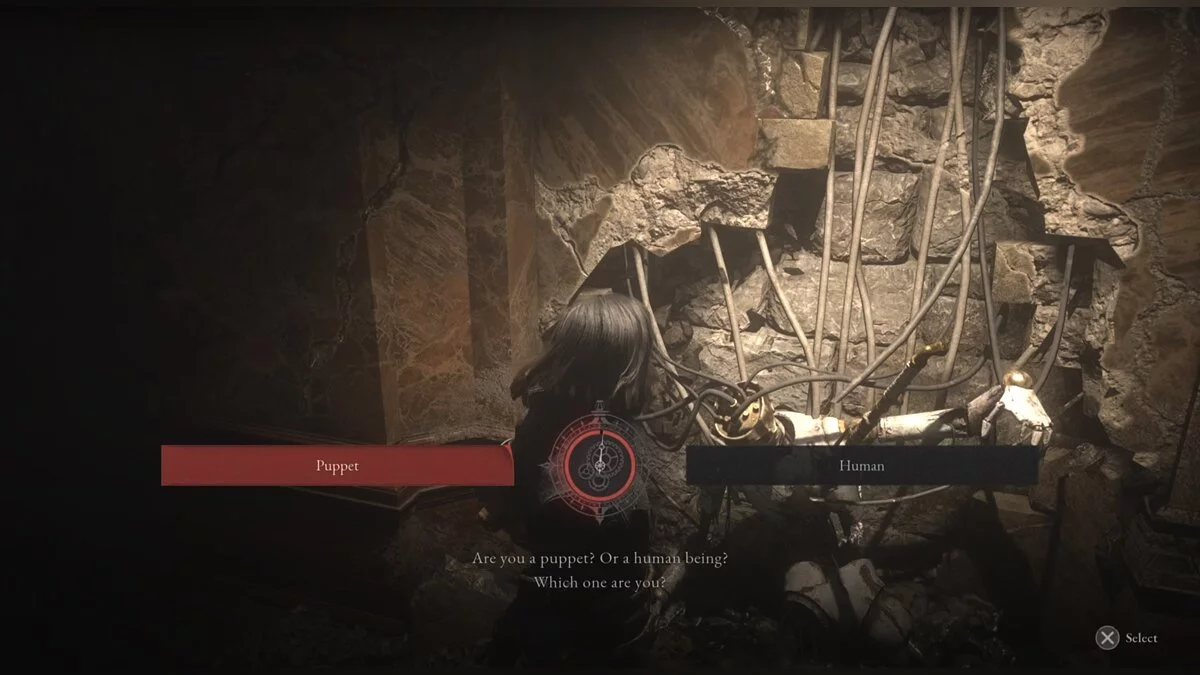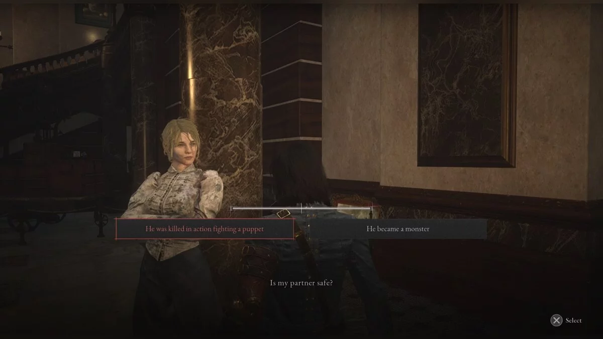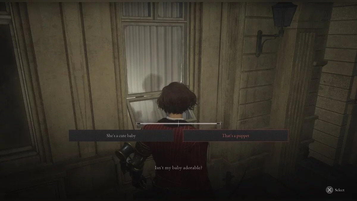 Двигайтесь по уровню вперед, пока не доберётесь до коридора. Справа будет большая марионетка, которая копается в горе трупов. Это место перед битвой с боссом-полицейским. Победите марионетку и заберите среди тел куклу-ребенка. Забрав предмет, вернитесь к плачущей женщине и отдайте «дочь». Выберите, что ей сказать: