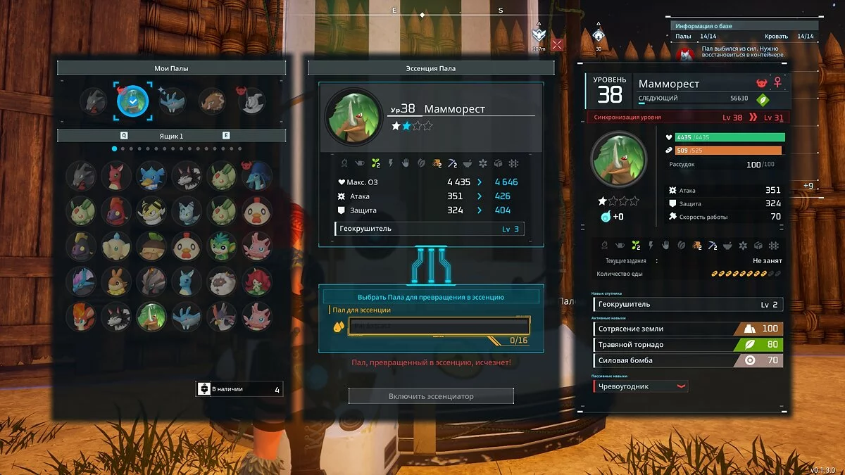 Однако важно помнить, что если ваш Пал потеряет все здоровье, его придется поместить в контейнер для Палов на 10 минут для возрождения. Есть и ещё один способ: если в вашем контейнере есть существо с умением «Производство лекарств», можете выложить погибшего зверька прямо на базу. Приятель с этим умением любезно отнесёт его в кровать, где тот восстановит здоровье за несколько минут.