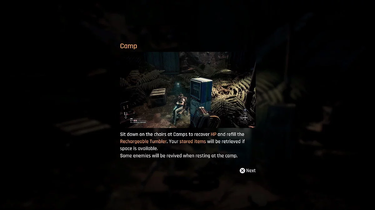А слева вы обнаружите лагерь. Сядьте в кресло, чтобы восстановить здоровье и пополнить запас аптечек. При помощи терминала вы можете купить расходники, а также потренироваться в сражениях.