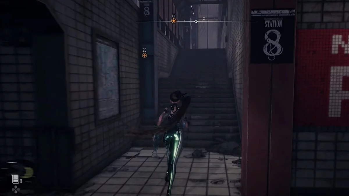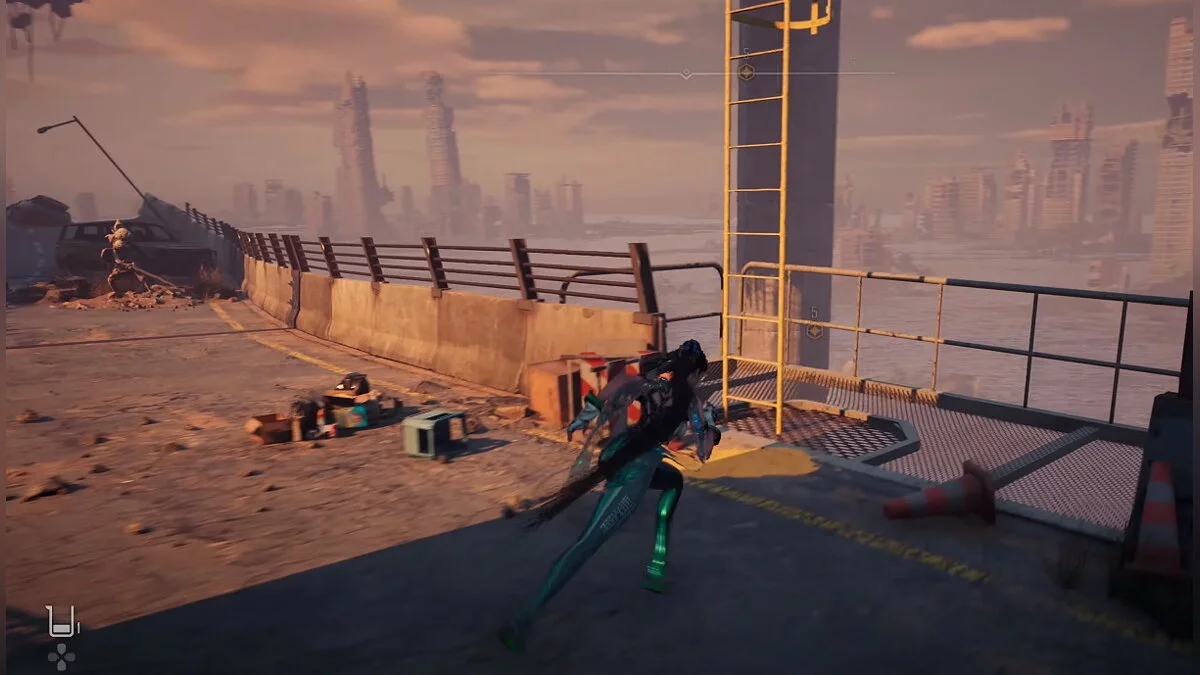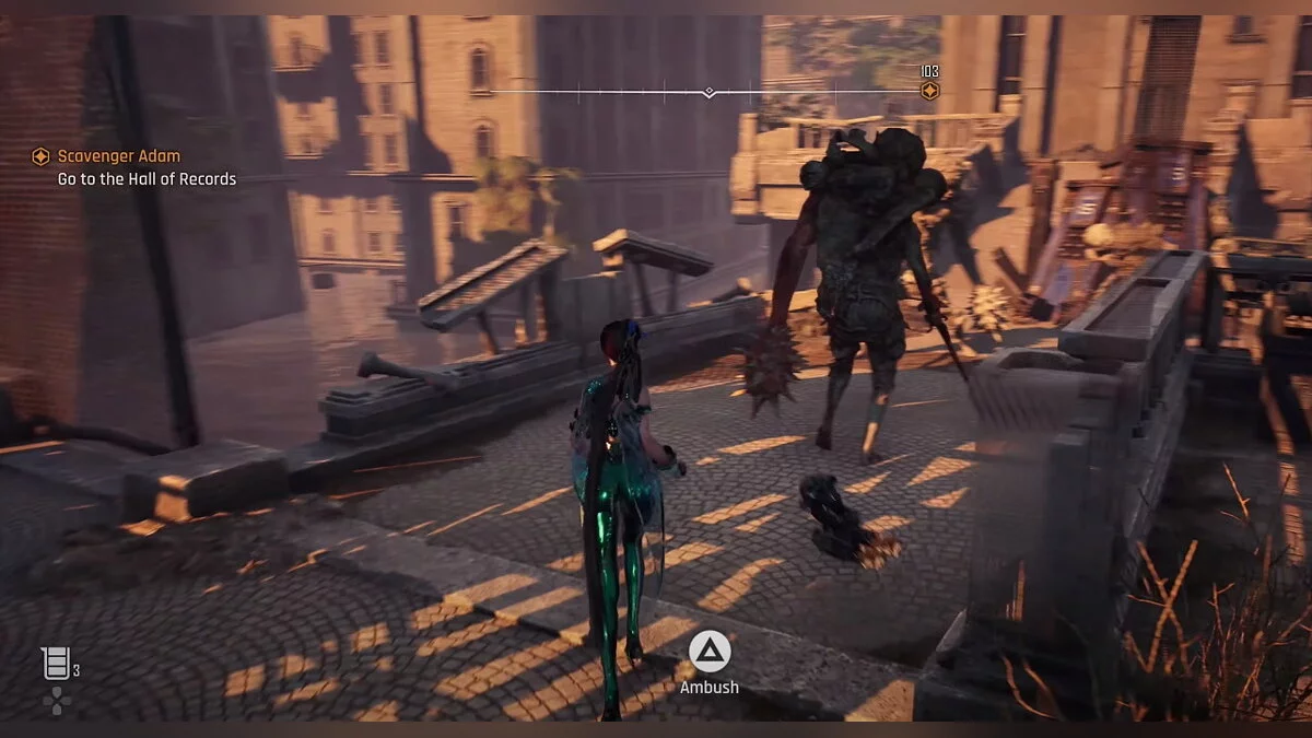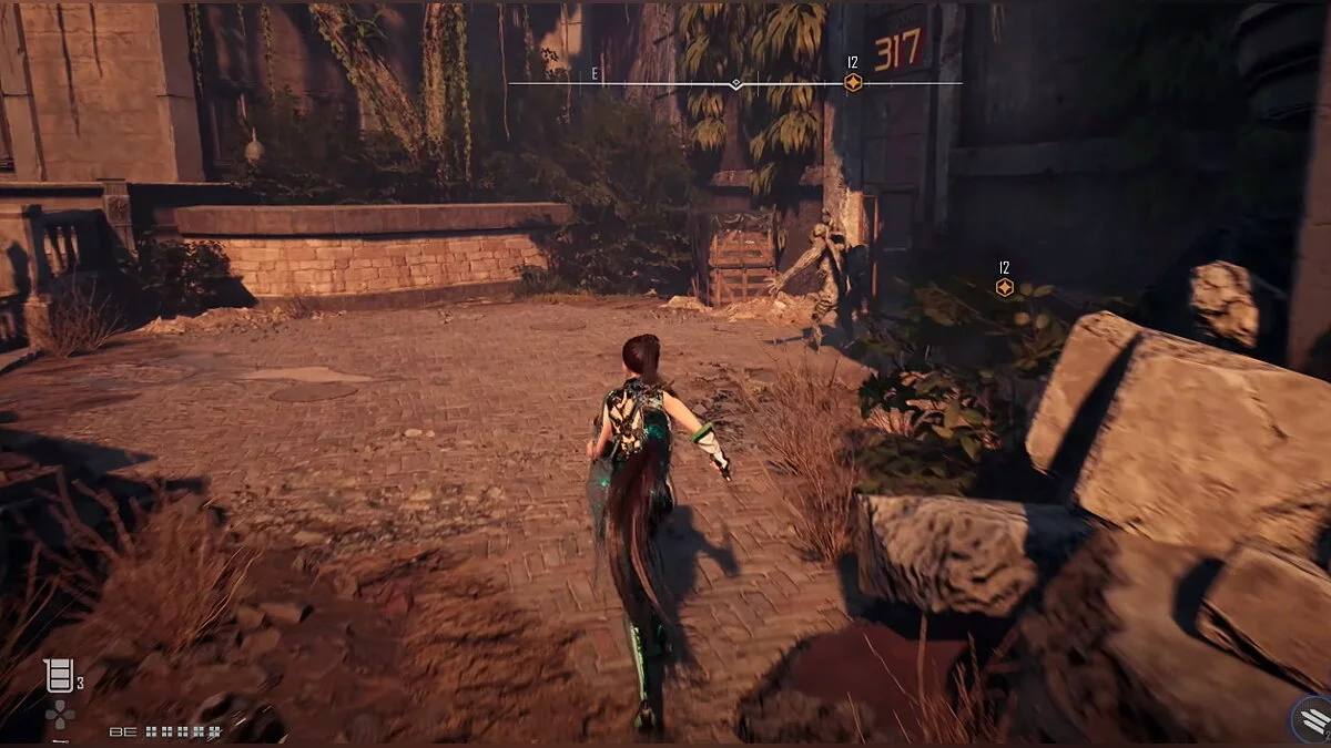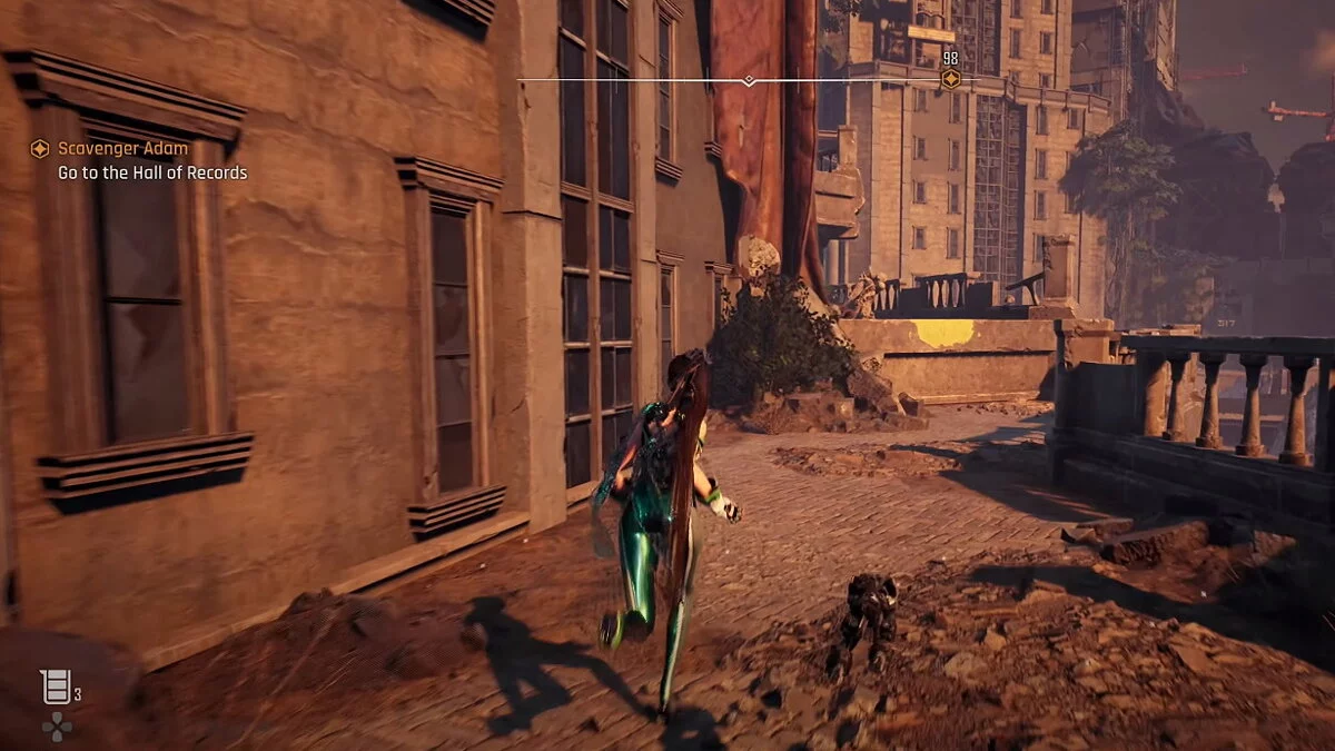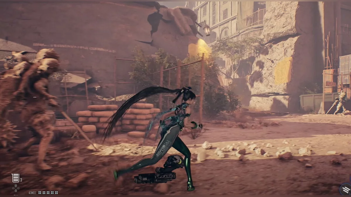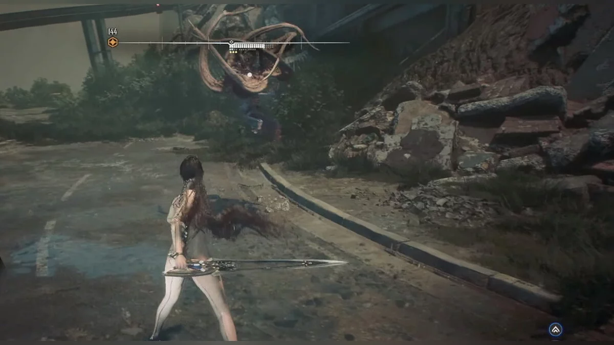 Возвращайтесь обратно на главную улицу. Бегите к пропасти, а затем поворачивайте налево. В ролике вам презентуют новый тип монстров. У него мощные лобовые атаки, которые складываются в серию ударов. Рекомендуем уклоняться от них, заходить к пришельцу со спины или с боков и бить лёгкими выпадами. Если они начнут разгон — прыгайте в сторону и преследуйте. Инопланетянин может врезаться в стену и быть оглушён. У вас будет возможность нанести несколько сильных ударов.