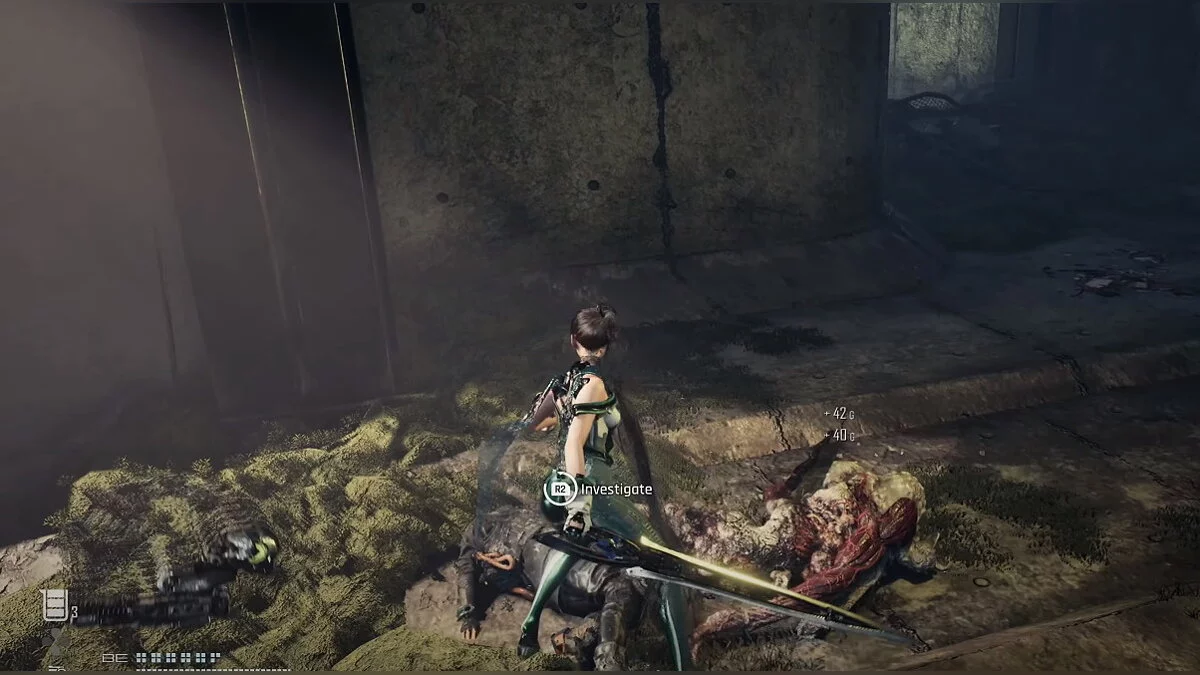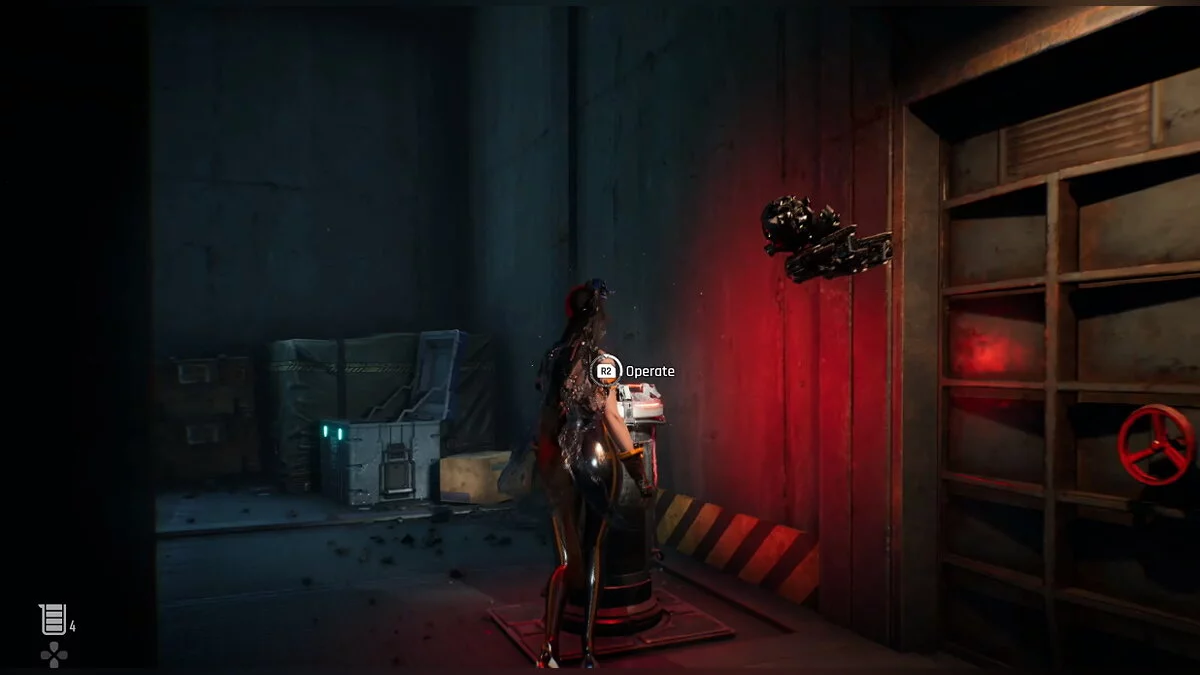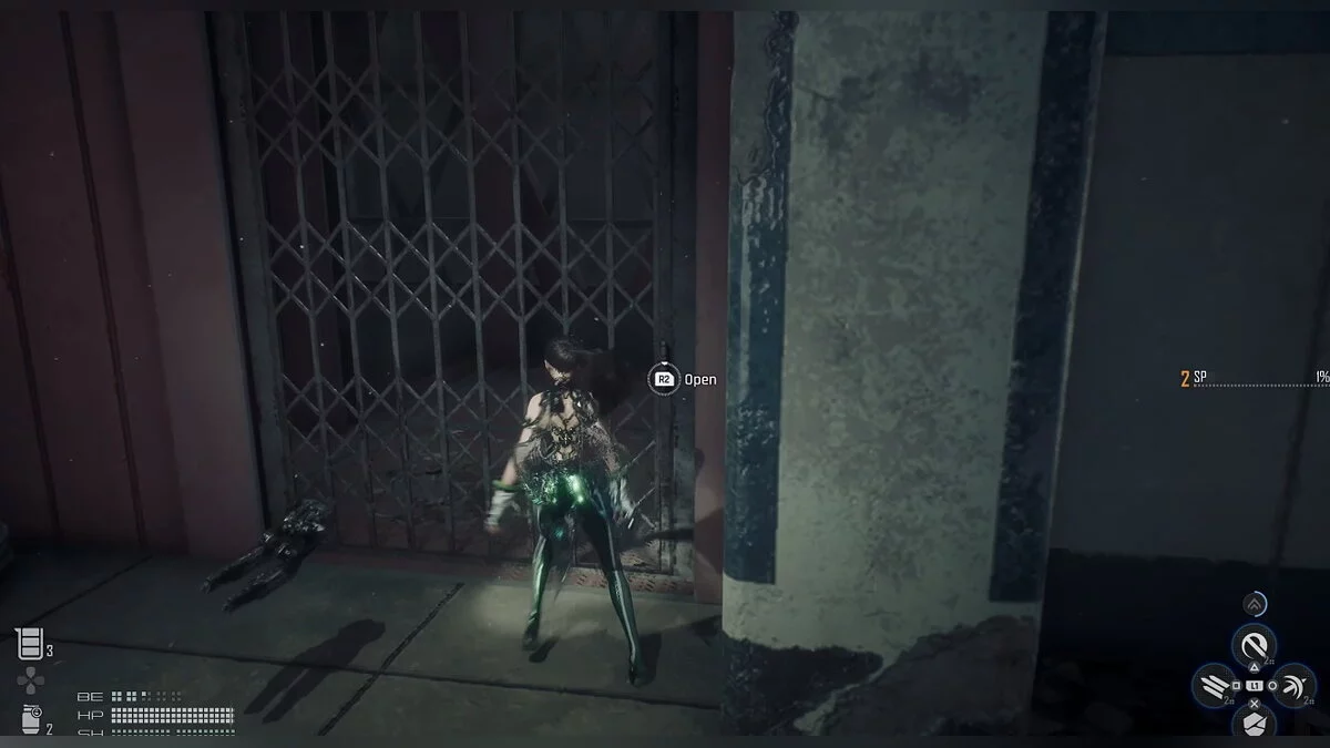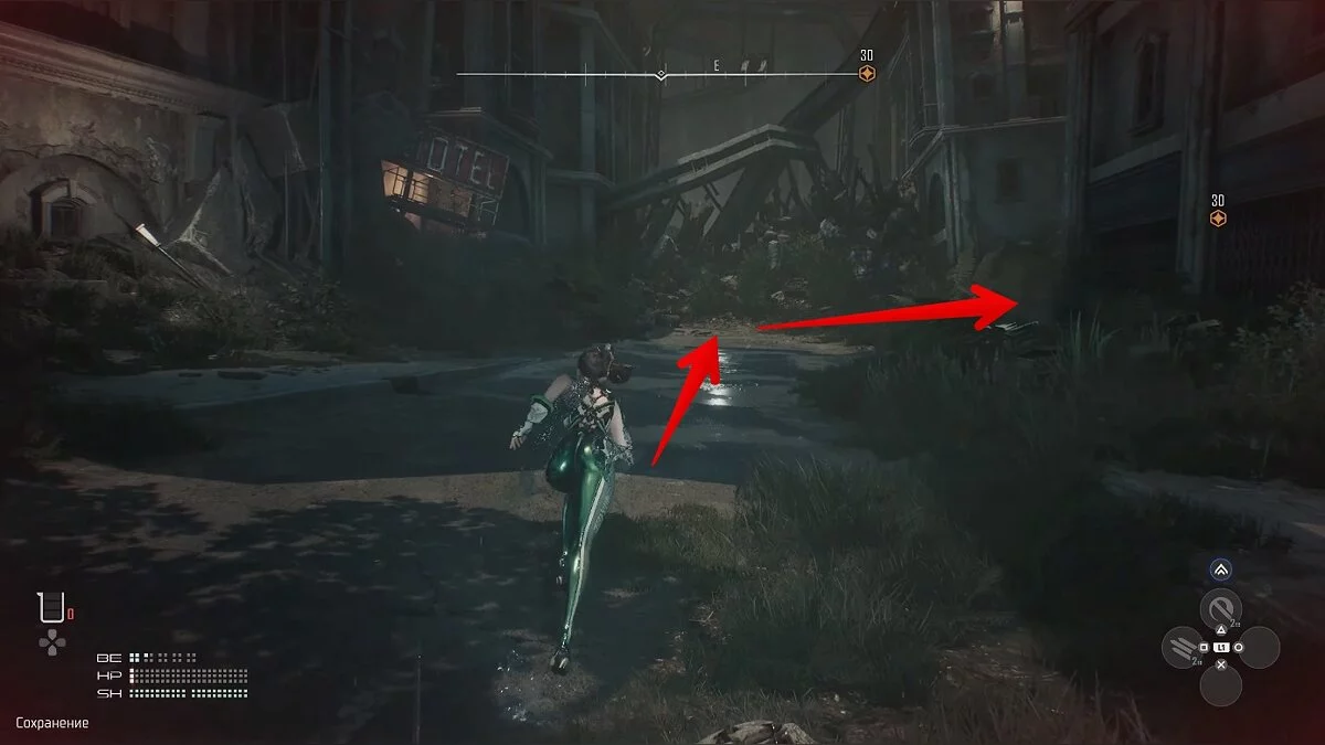 Во время боя с гуманоидным пришельцам вы можете попробовать провести идеальное уклонение. Для этого нажмите «кружок» за мгновение до атаки монстра. После этого у вас появится возможность безопасно провести серию ударов. В гараже справа вы найдёте ящик с запасами легиона.