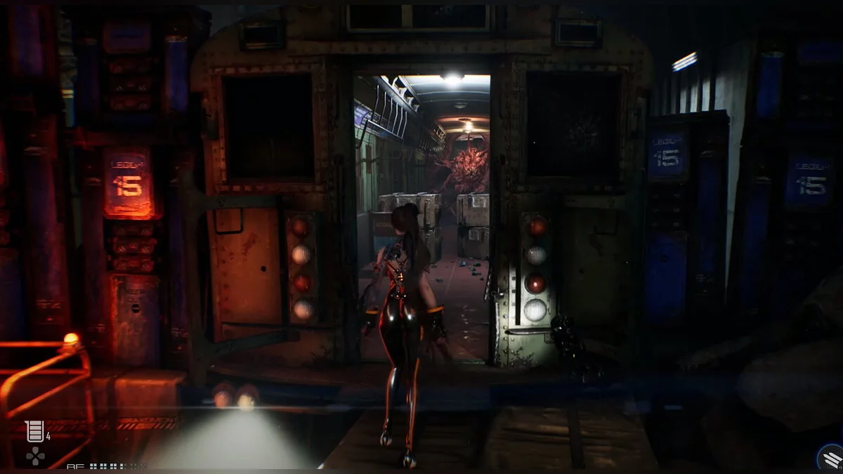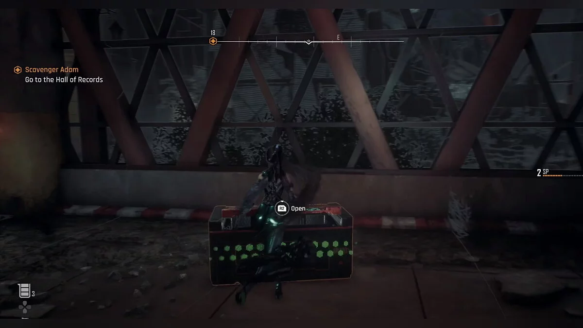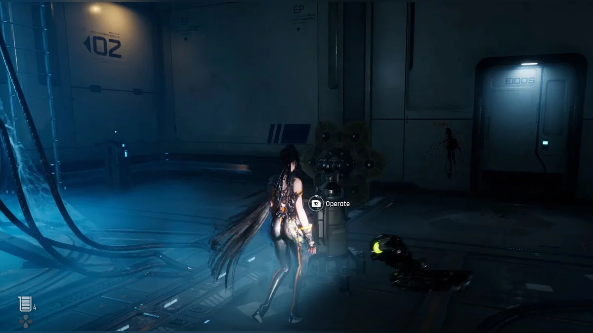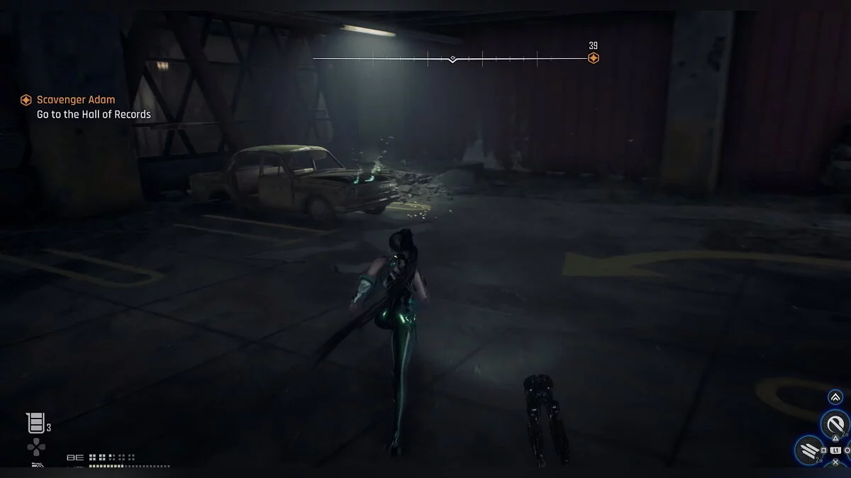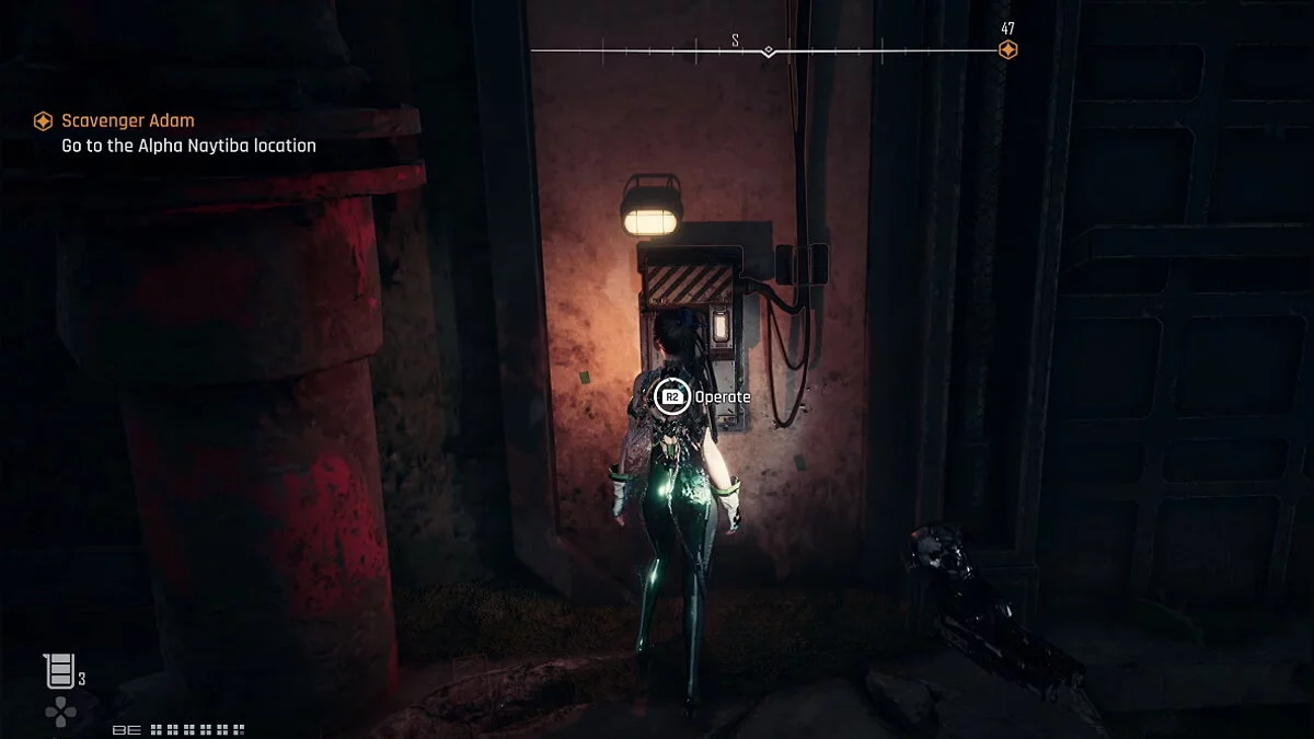 Во время боя с гуманоидным пришельцам вы можете попробовать провести идеальное уклонение. Для этого нажмите «кружок» за мгновение до атаки монстра. После этого у вас появится возможность безопасно провести серию ударов. В гараже справа вы найдёте ящик с запасами легиона.