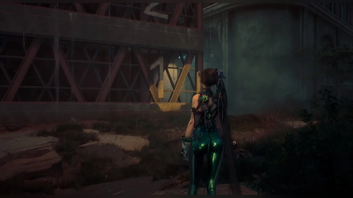 Когда окажетесь на парковке, первым делом двигайтесь влево. Там находится ящик с материалами. В центре помещения есть противник. Если подойдёте к нему сзади, то сможете убить одним ударом. Ещё один пришелец бродит в дальнем левом углу здания. Одолейте его и открывайте решётчатую дверь. Таким образом вы разблокируете срезку.