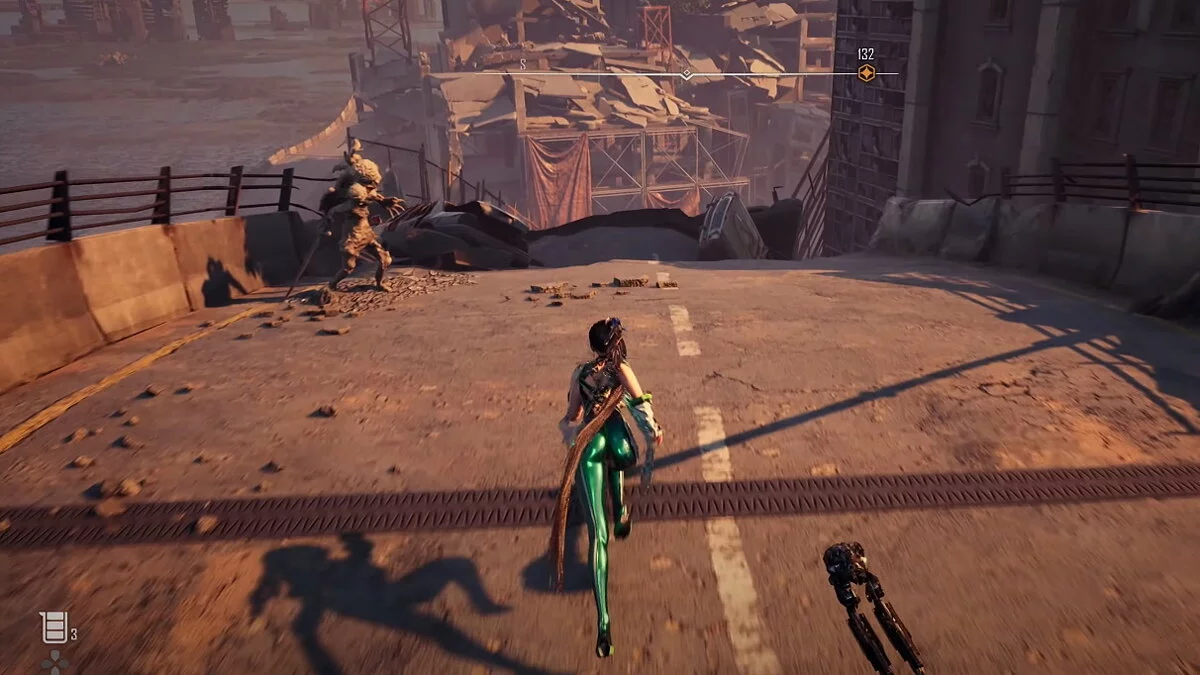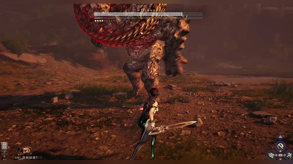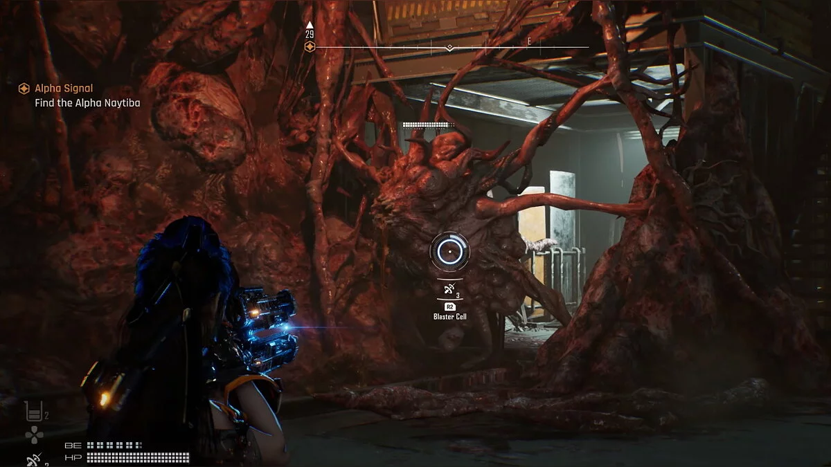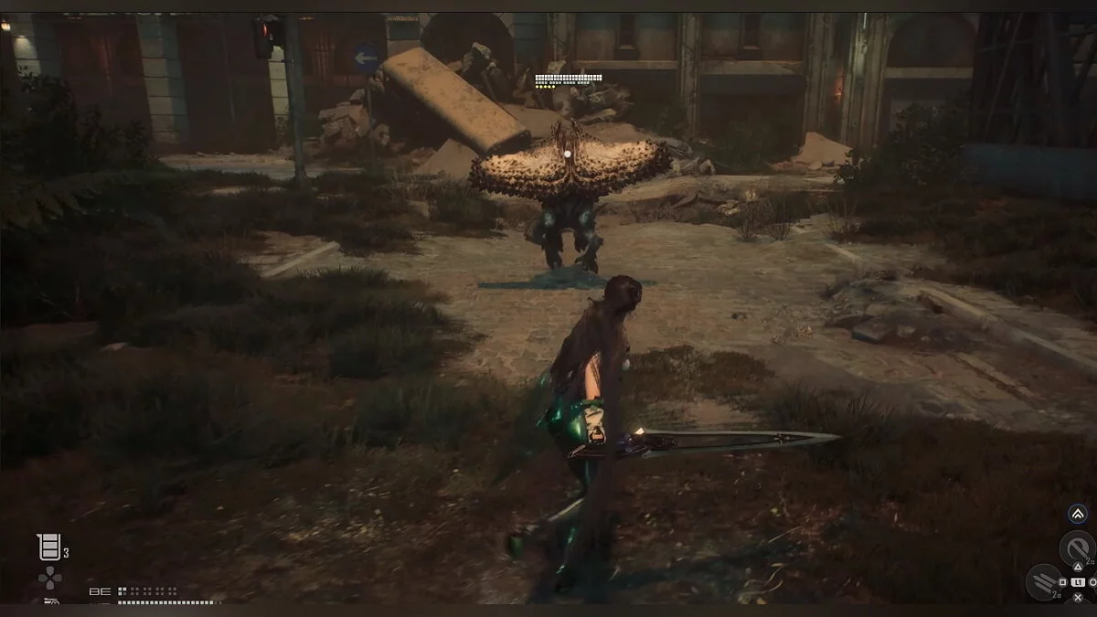 После вступительного ролика нажимайте кнопку R2 несколько раз, чтобы открыть люк. Затем коснитесь клавиши R2 снова, чтобы взять Тахи за руку. Преследуйте девушки вступайте в бой с пришельцами. «Квадрат» на Dualsence отвечает за лёгкую атаку, а «треугольник» — за сильный удар. Для блокирования вражеских ударов используйте кнопку L1. Если вы нажмёте эту клавишу за мгновение до атаки противника, то у вас получится совершить парирование. После победы над инопланетянами продолжайте бежать за Тахи. Перепрыгивайте через упавший столб и одолейте очередную группу монстров. При помощи нажатия на правый стик (R3) вы можете выбрать текущую цель. Перед ударом пришельцы слегка задирают лапу назад. В этот момент стоит нажать блок (L1), чтобы отразить атаку и нанести контрудар. Сочетание клавиш L1+квадрат позволит применить особо мощное бета-умение. Он расходует бета-энергию, которая накапливается за счёт попаданий по врагам и парированиям.