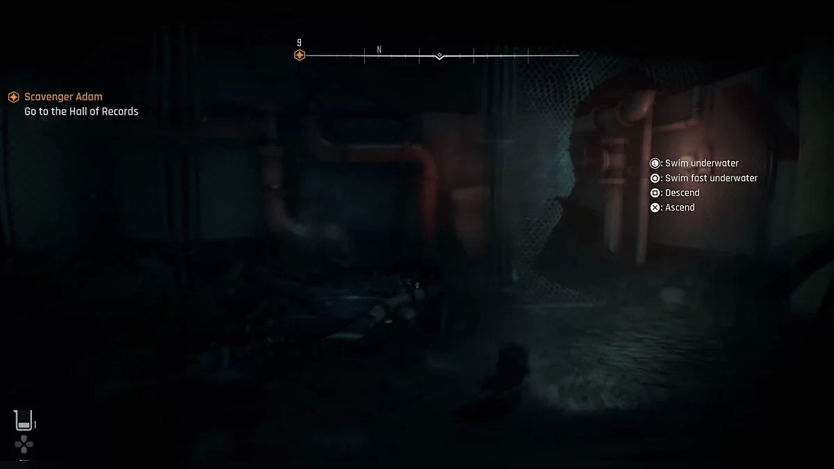 Спускайтесь вниз, прыгайте в воду и плывите в левую сторону. Текущей целью обозначена дверь, но открыть её без пароля не получится. Но найти его несложно. Двигайтесь направо, проходите через решётку и поворачивайте налево.
