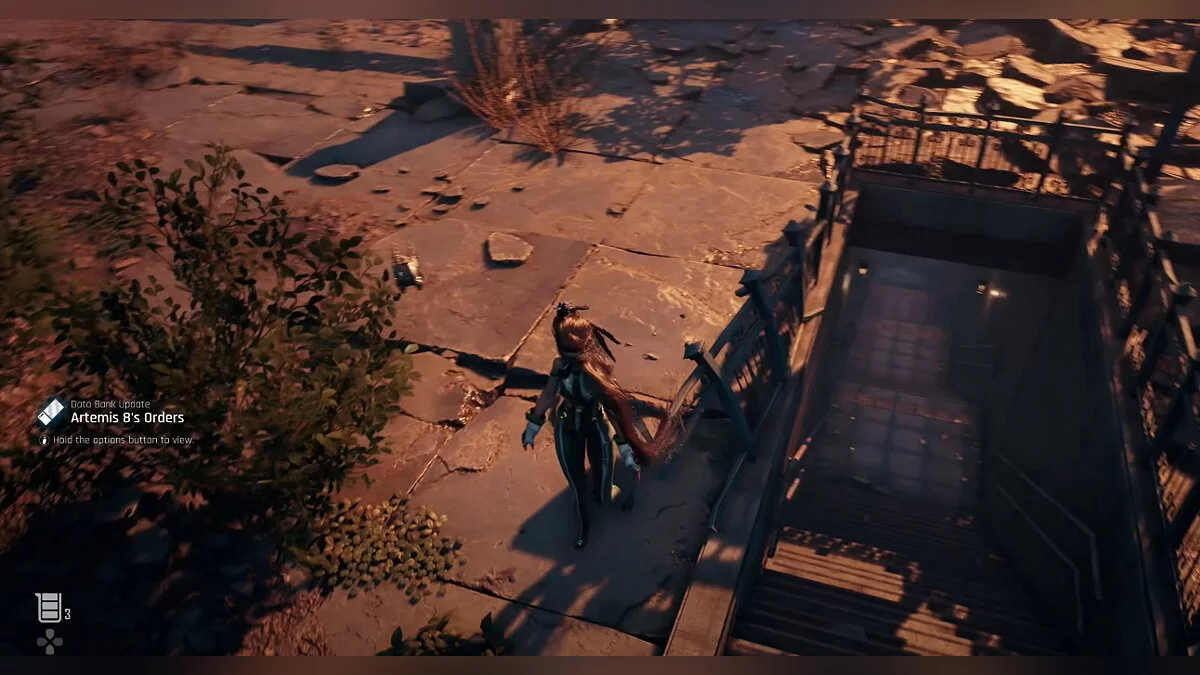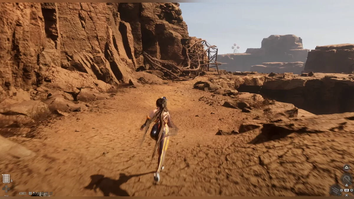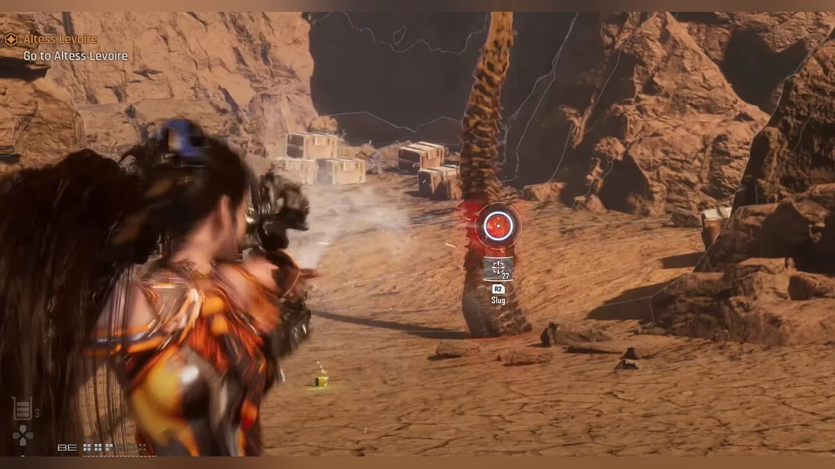 После сражения вам предстоит пробежка вместе с Тахи по пустынной местности. Нажмите на левый стик (L3), чтобы ускориться. Внимательно следите за поверхностью земли и обходите зоны, которые отмечены красными кругами. Они указывают, куда прилетит снаряд.