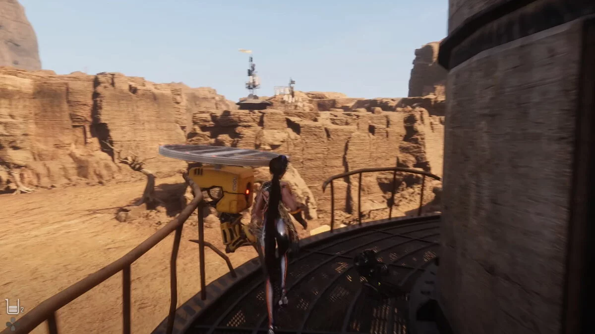 Бегите дальше по балкону и прыгайте от одного мостка к другому, пока не заберётесь на самый верхний из них. Взаимодействуйте с роботом.