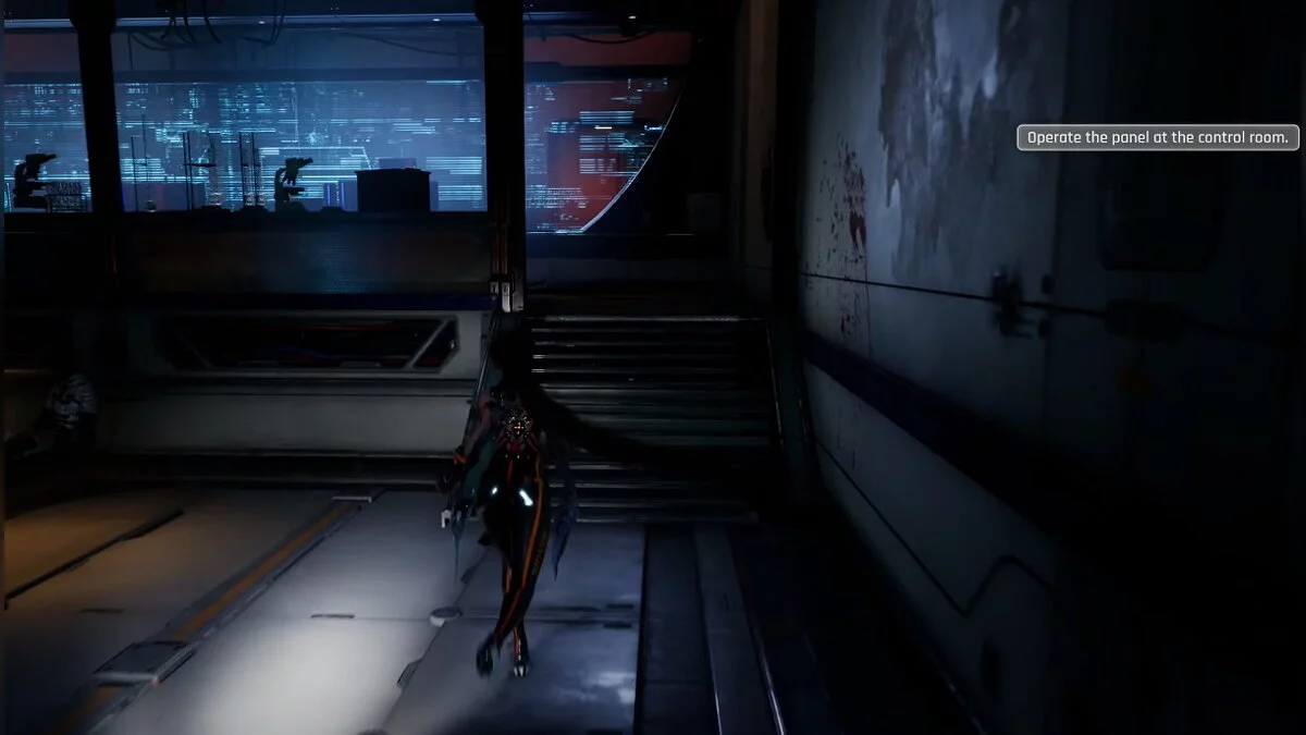 Заходите в лифт и спускайтесь вниз. В этой локации использовать клинки не получится. При необходимость полагайтесь на огнестрел. Обратите внимание, что у оружия есть несколько режимов стрельбы. Идите вперёд и открывайте двери при помощи кнопок, которые находятся рядом с ними.