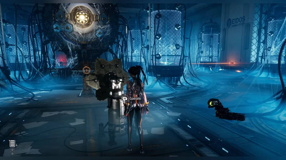 Выдвинется мост, по которому можно будет пройти вперёд. Двигайтесь по мосткам дальше. За ближайшей открытой дверью лежит апгрейд для вашего дрона-пистолета и кнопка, которая активирует луч в комнате.