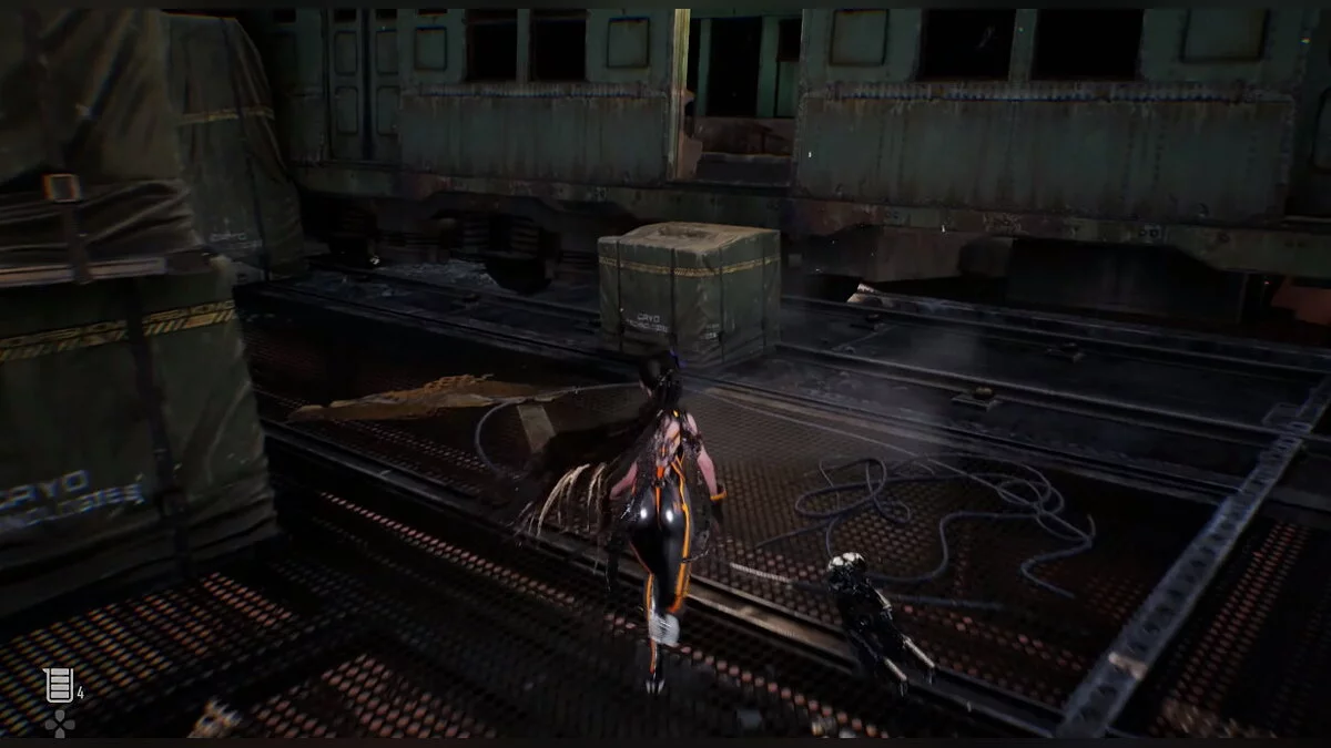 Бегите сначала по рельсе, затем — по крыше. Одолейте гибрида с колонной в руках и проверьте содержимое контейнера. По лестнице спускайтесь вниз. В закутке справа есть ящик с припасами. Обыщите его и бегите в противоположную сторону вдоль рельс.