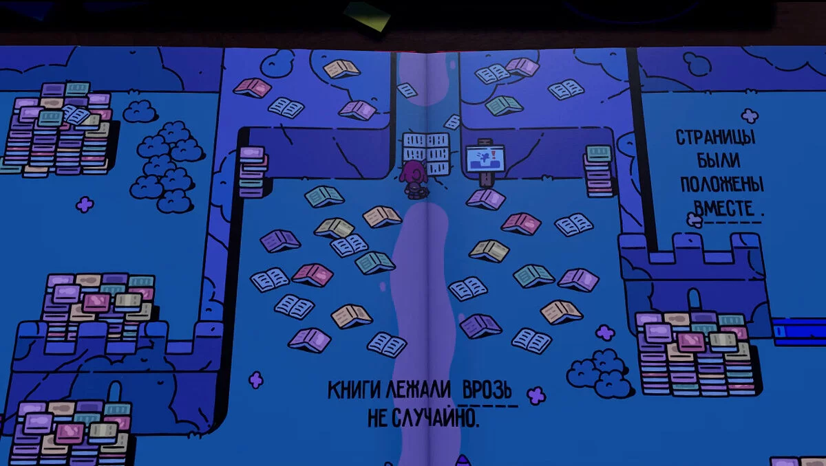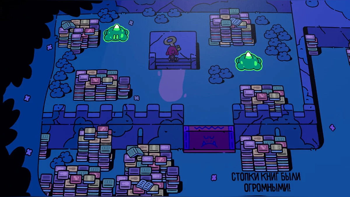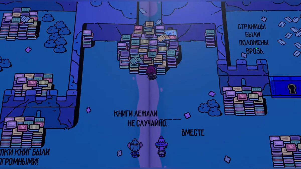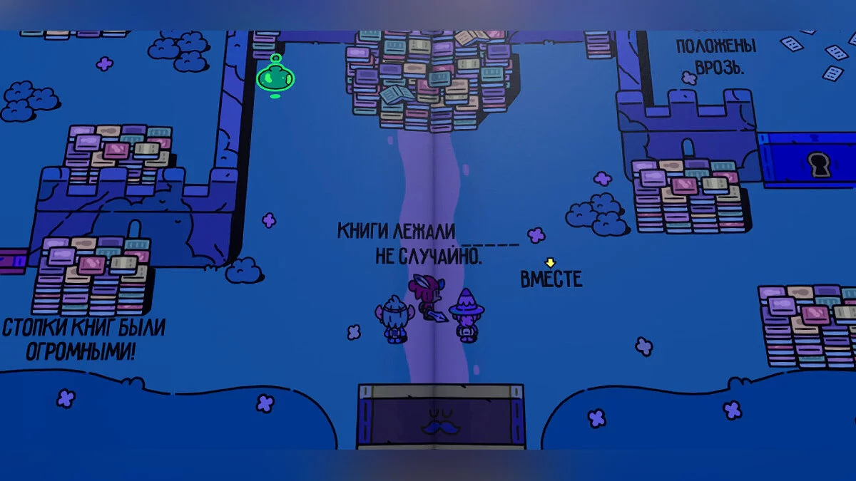 На шляху вам зустрічається велика кількість розкиданих книг і пов'язана з цим загадка. Спочатку помітимо, що у фразі перед книгами підсвічується слово «разом», і не забудемо забрати сувій, який знаходиться в лівому нижньому куті локації. Тепер пройдіть у ліву частину, щоб перемогти монстрів і забрати ключ для відкриття правої половини.