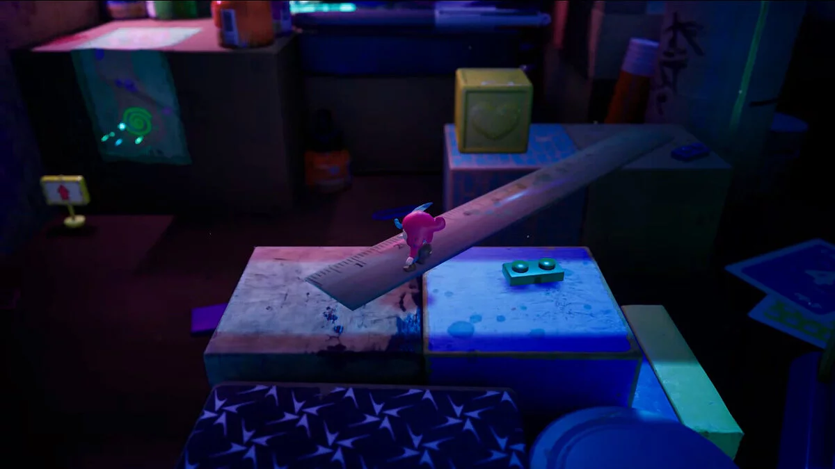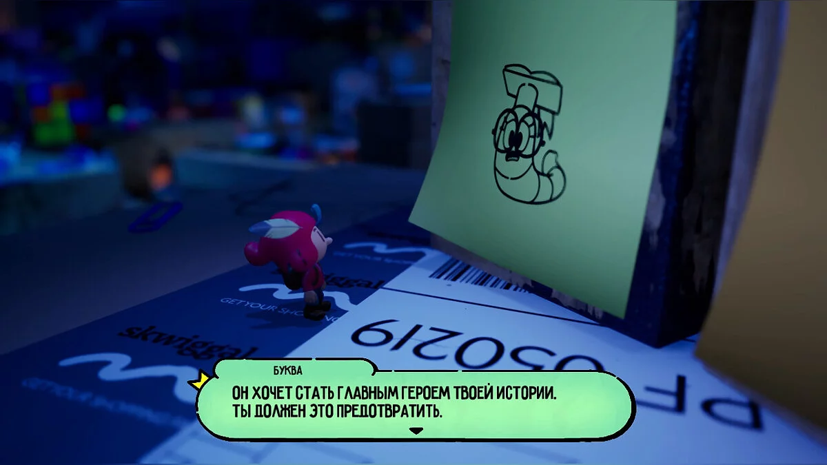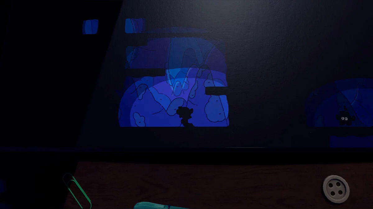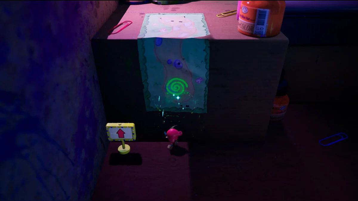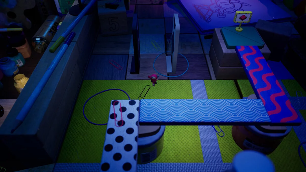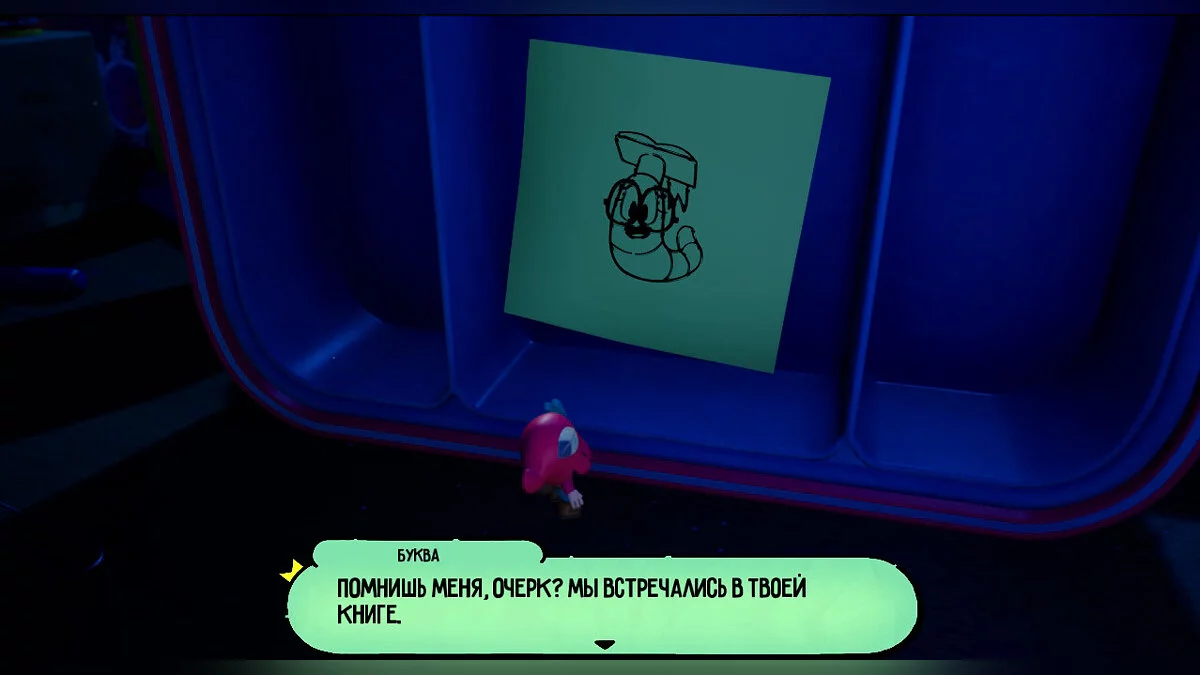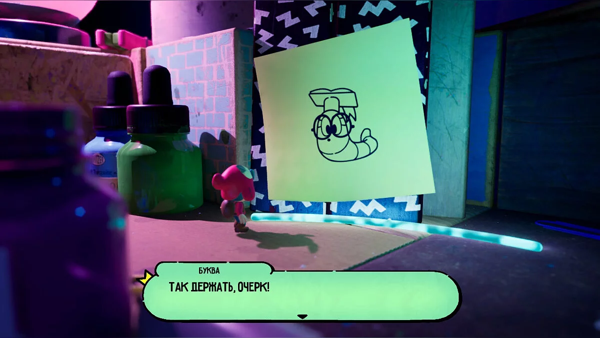 Опинившись у новому світі, поступово досліджуйте територію: на півночі від книги вас чекає палітра з фарбами, щоб забратися по ній далі. Там вам зустрінеться незвичайний контейнер, в якому нас буде чекати книжковий черв'як Буква. Ми вже зустрічали її у переправі через ріку.