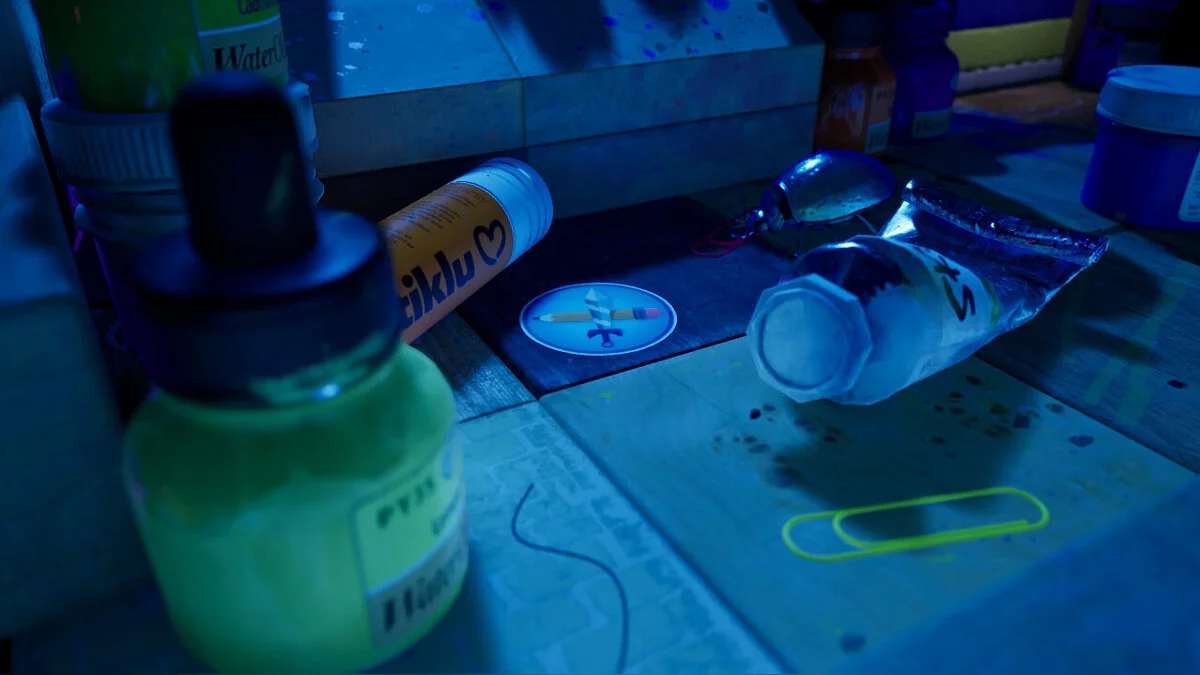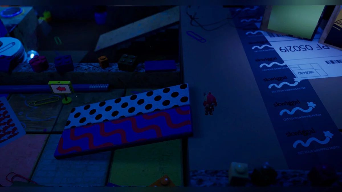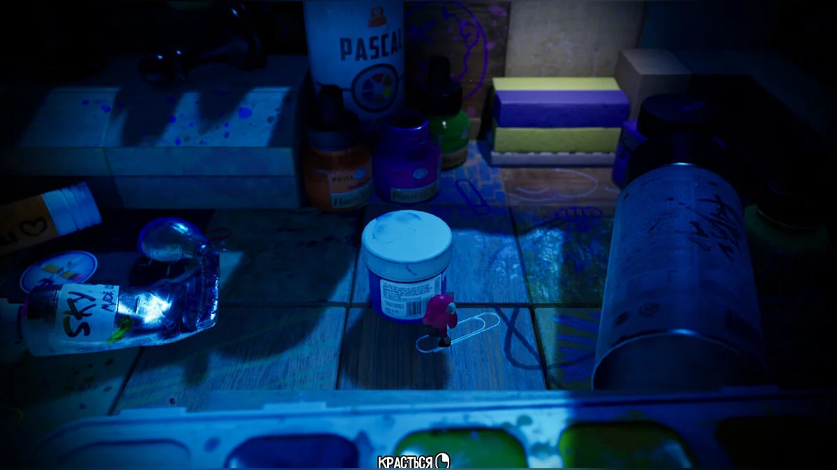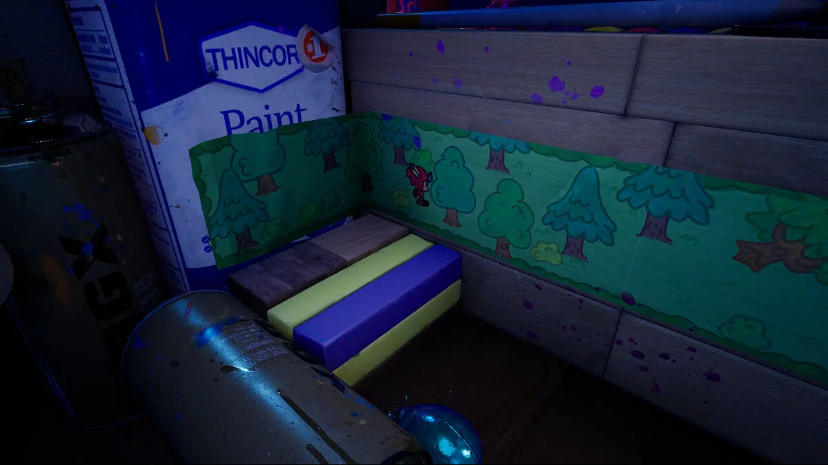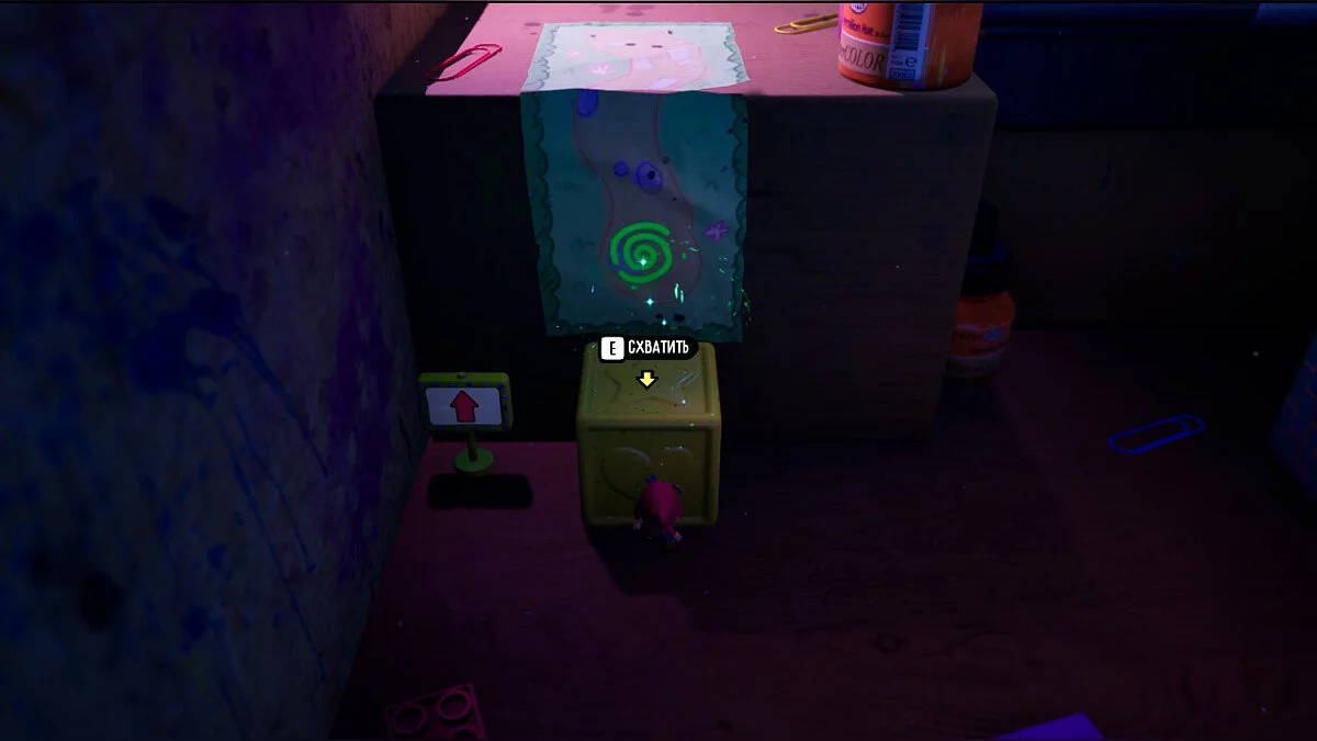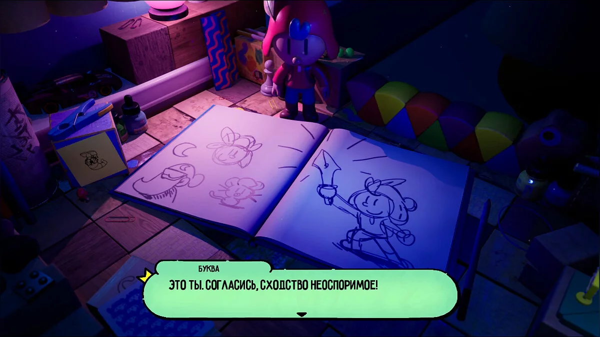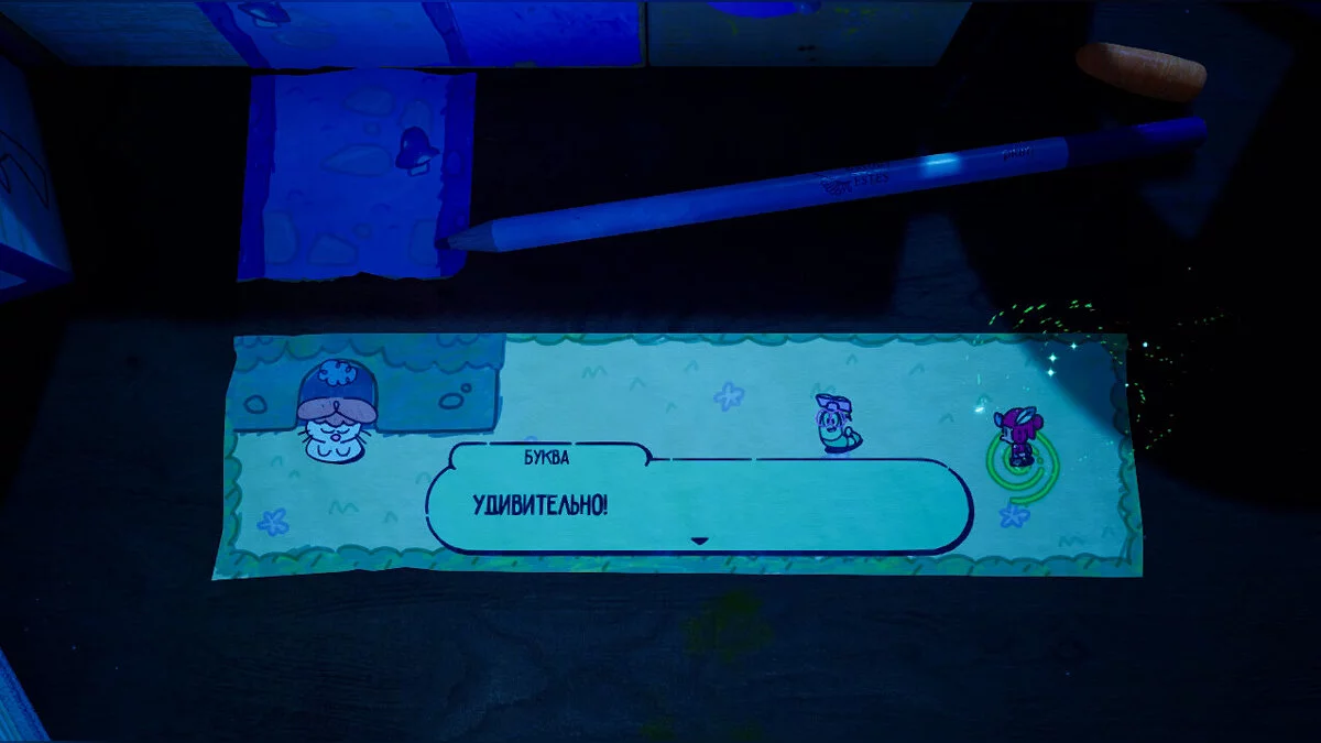 Опинившись у новому світі, поступово досліджуйте територію: на півночі від книги вас чекає палітра з фарбами, щоб забратися по ній далі. Там вам зустрінеться незвичайний контейнер, в якому нас буде чекати книжковий черв'як Буква. Ми вже зустрічали її у переправі через ріку.