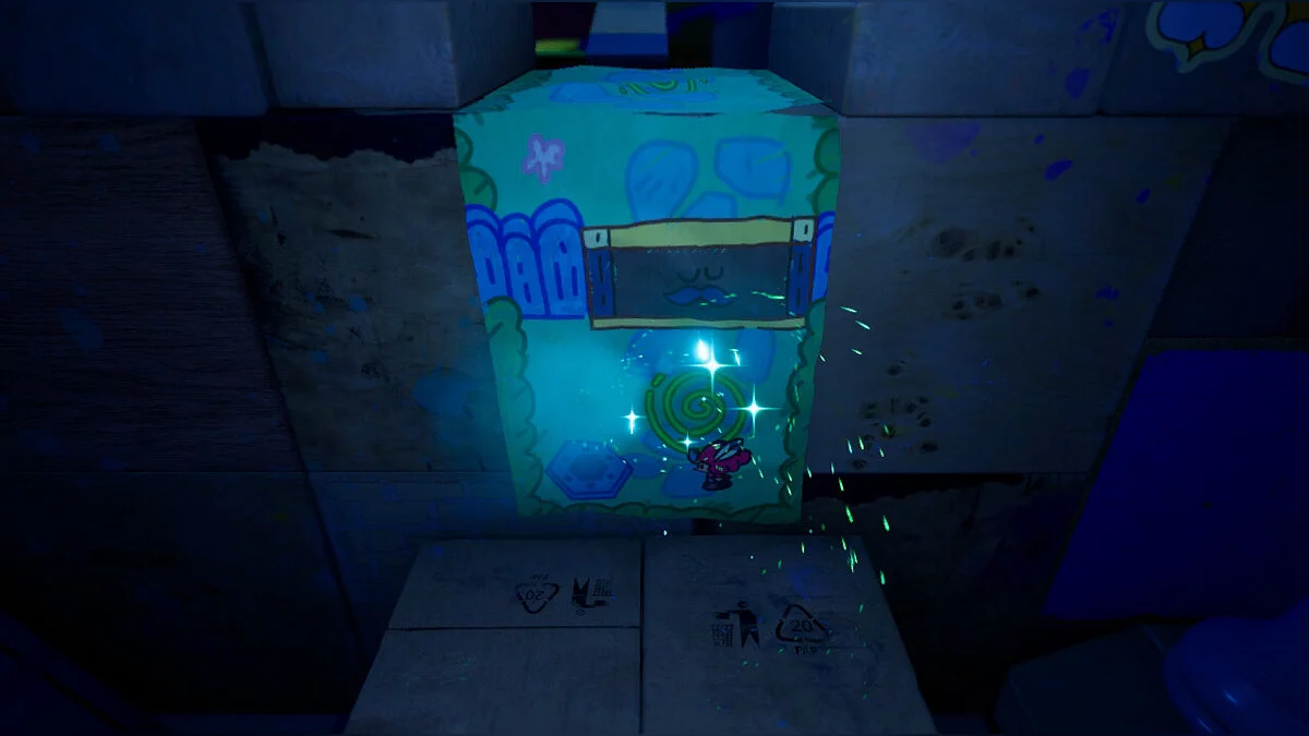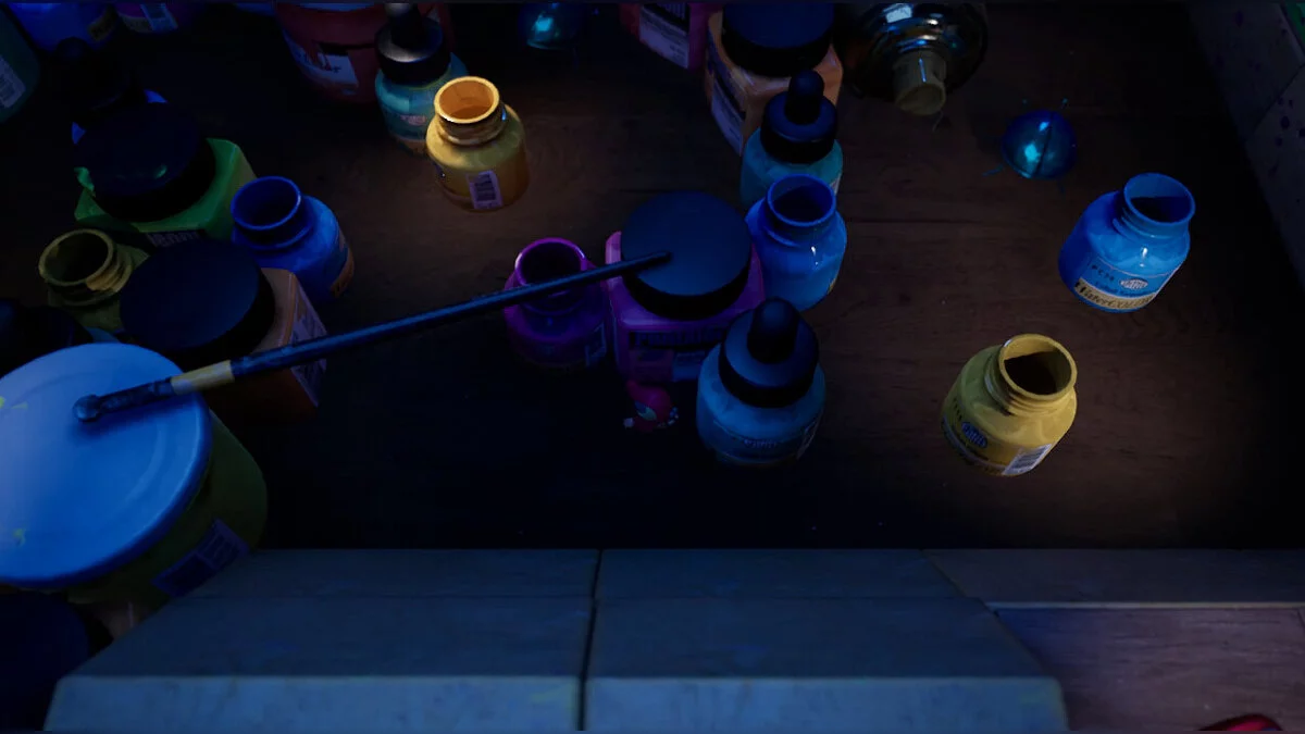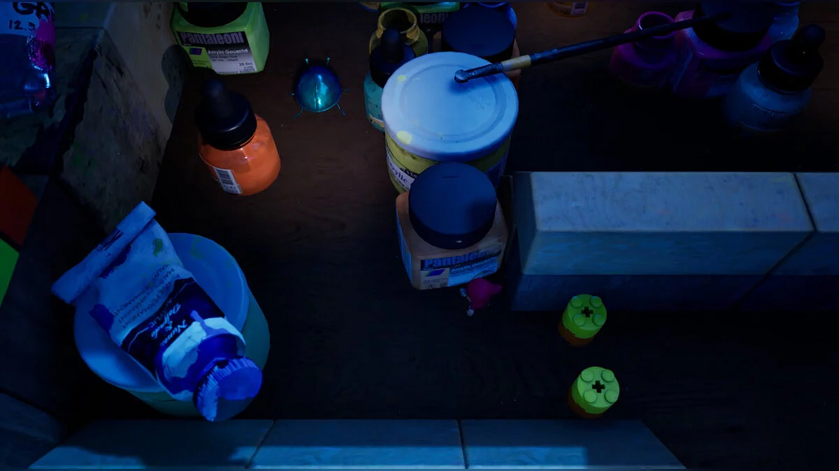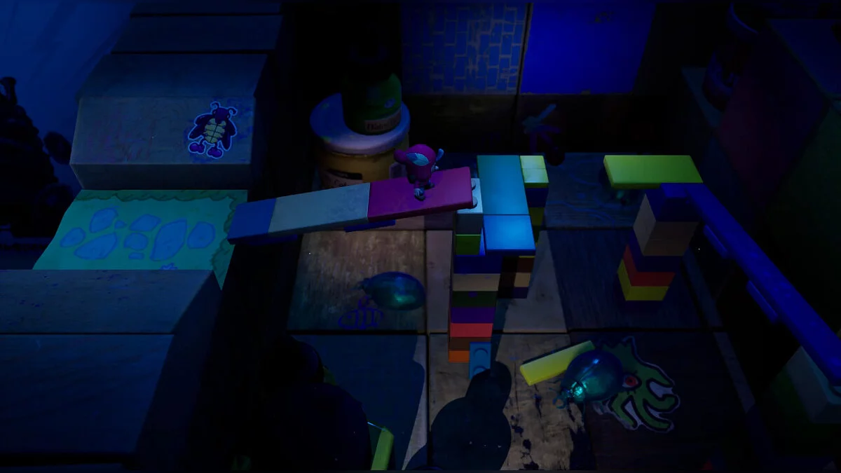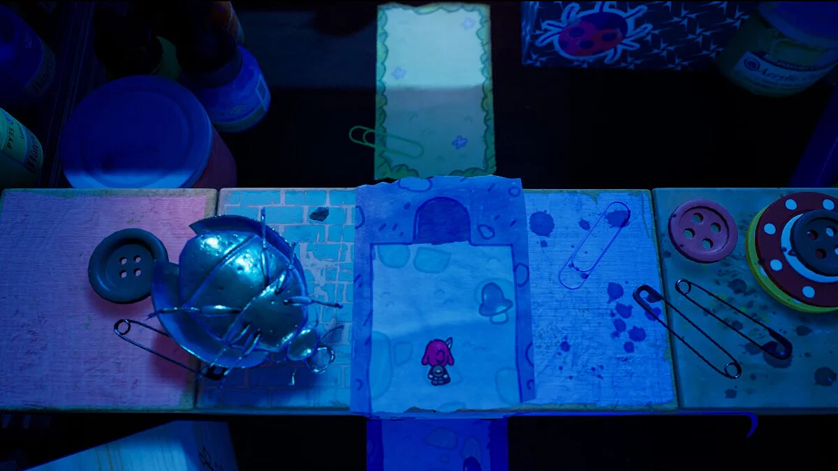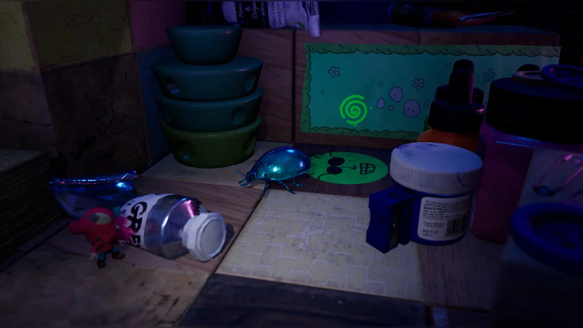 Третій жук найскладніший: нам потрібно піднятися вгору, використовуючи як укриття дві баночки справа. Там нас чекає стрибок на виступ, щоб увійти в портал і добратися через намальований світ до кубика.