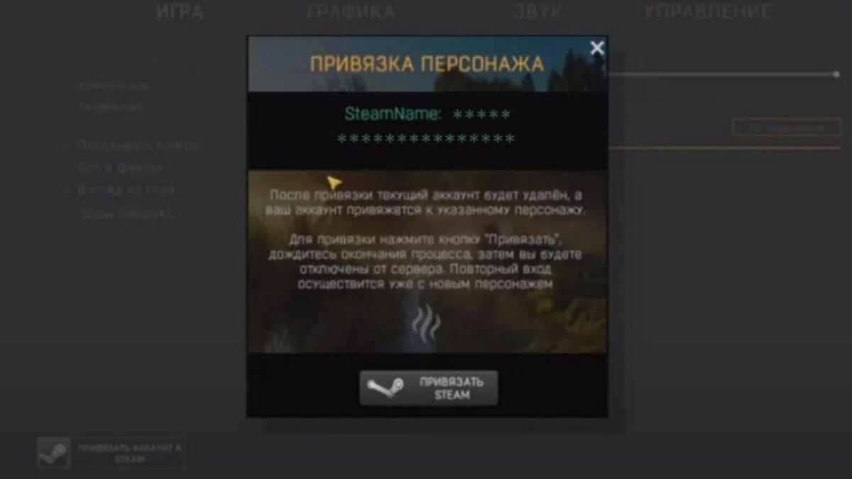 Запускаємо Steam клієнт, щоб він працював у фоновому режимі. Це обов'язкова умова для прив'язки. Саму гру на Steam не запускаємо. Після закінчення установки гри на VK Play, заходимо в гру через портал VK Play, а не через Steam клієнт. Не переплутайте ярлики, краще заходьте з вікна самої платформи. На головній сторінці гри натискаємо «Почати гру». після чого система запропонує створити нового персонажа. Вводимо нік, можна написати абсолютно будь-який нік який хочете, це не важливо і входимо в гру. Після появи на стартовій локації можна переходити до переприв'язки до акаунту Steam. Натискаємо кнопочку Esc і переходимо до вкладки Гра. Там ви побачите кнопочку «Прив'язати акаунт Steam». Якщо дана кнопка не з'явилася, значить у вас, можливо, не запущено Steam. Перевірте ще раз і перезапустіть гру. Натискаємо на кнопочку «Прив'язати акаунт Steam» і перед вами з'явиться вікно прив'язки персонажа, де буде позначений ваш акаунт Steam, ігровий акаунт з рівнем і ніком персонажа і кнопка "Прив'язати (див. скріншот) Уважно перевірте і переконайтеся, що це дійсно той акаунт, який ви хочете прив'язати.