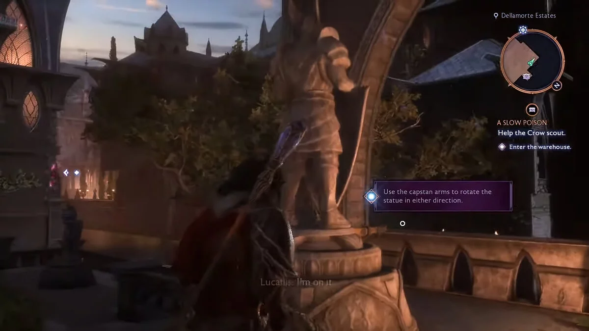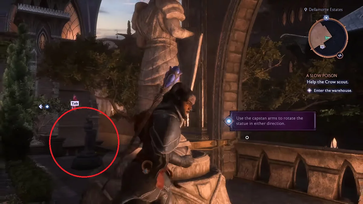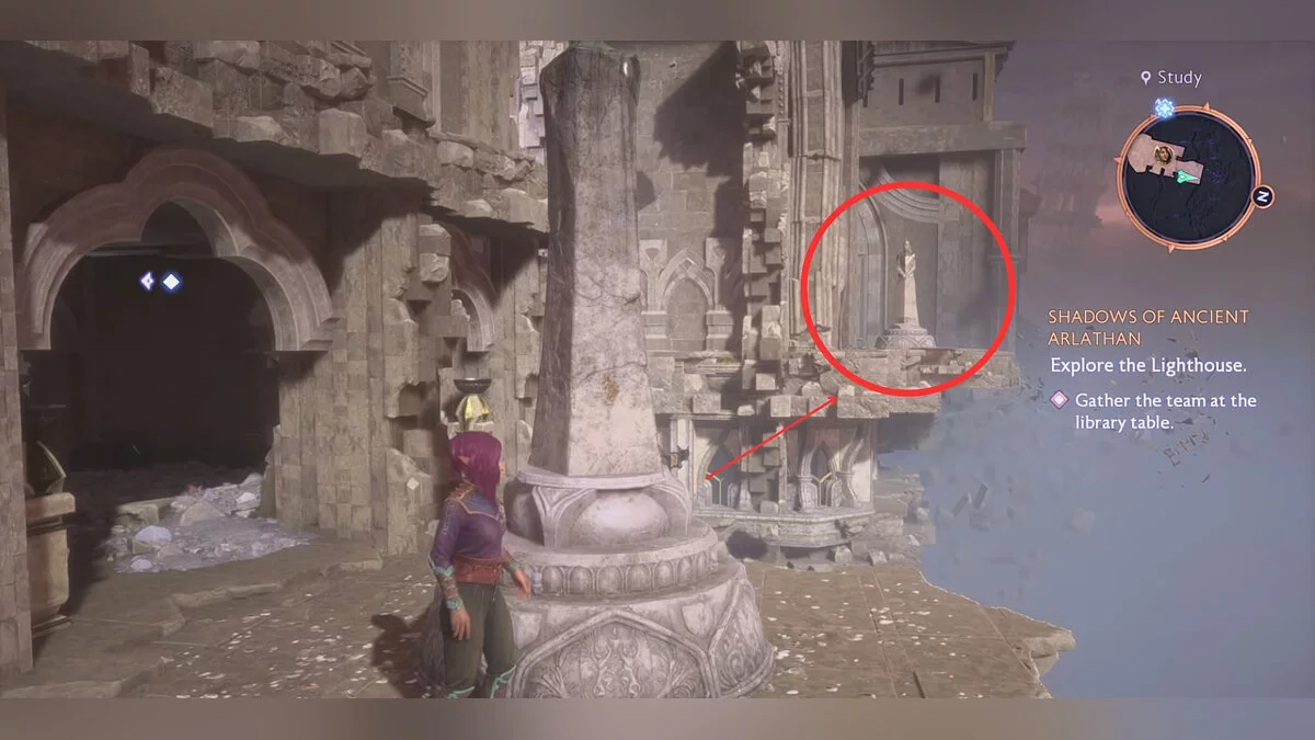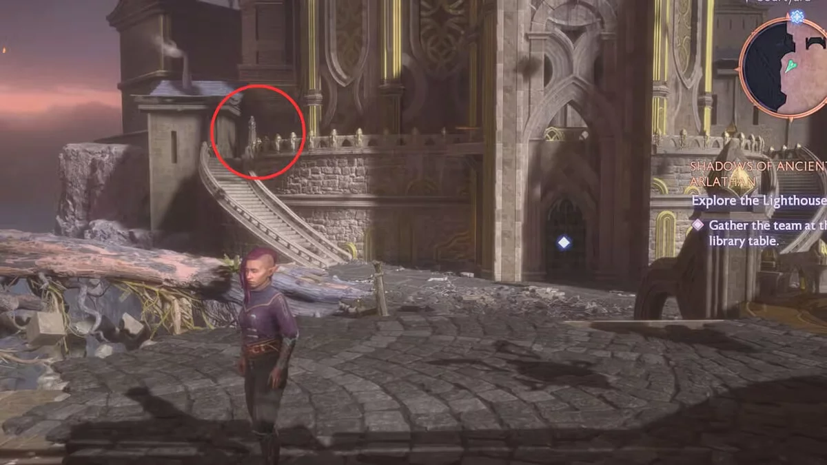 Поверніть цю статую на захід, щоб її обличчя дивилося на бібліотеку. Саме в цьому напрямку вам потрібно буде рухатися, щоб знайти близнюка статуї. Вам потрібно піднятися по зовнішніх сходах бібліотеки, щоб дістатися до неї.