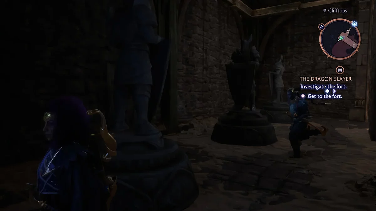 Відправляйтеся всередину фортеці, щоб знайти чотири статуї, розташовані поруч одна з одною. Поряд з кожною статуєю знаходяться щити, на яких вказані імена лицарів. Ваше завдання — правильно повернути кожну статую, щоб вони дивилися в потрібні напрямки. Зверніть увагу на щити, щоб зіставити імена та повернути їх у потрібному напрямку:
