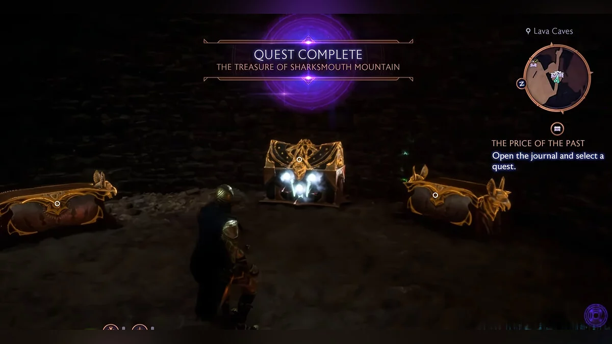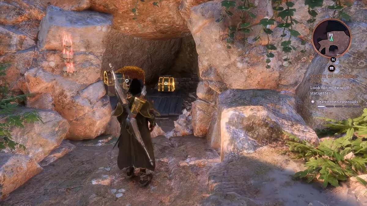 Зліва від останнього факела ви побачите, як стіна всередині скелі почне повільно опускатися вниз. Увійшовши в це приміщення, ви виявите кілька скринь, що містять корисне спорядження, а також трохи золота. Ці знахідки можуть виявитися вкрай цінними для вашої подальшої подорожі, тож не забудьте поповнити ними свій інвентар.