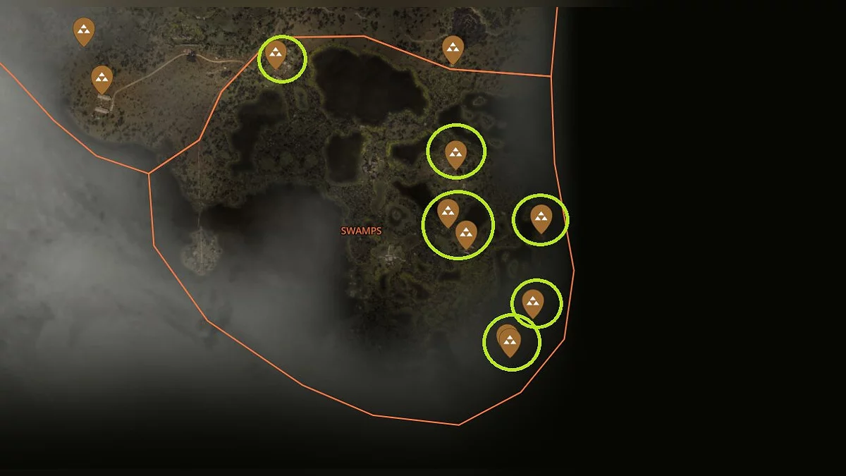 Болота — таємнича локація, з якою ви зіткнетеся, проходячи сюжетний квест «Крайня простота» (Extreme Simplicity). Також гравцям доведеться покинути це місце, рятуючись від небезпеки. Замість того щоб одразу виконати завдання, ви можете відшукати ці сім тайників: