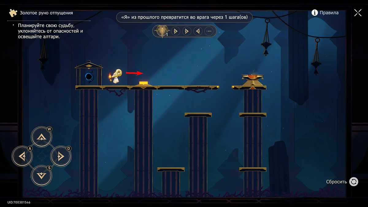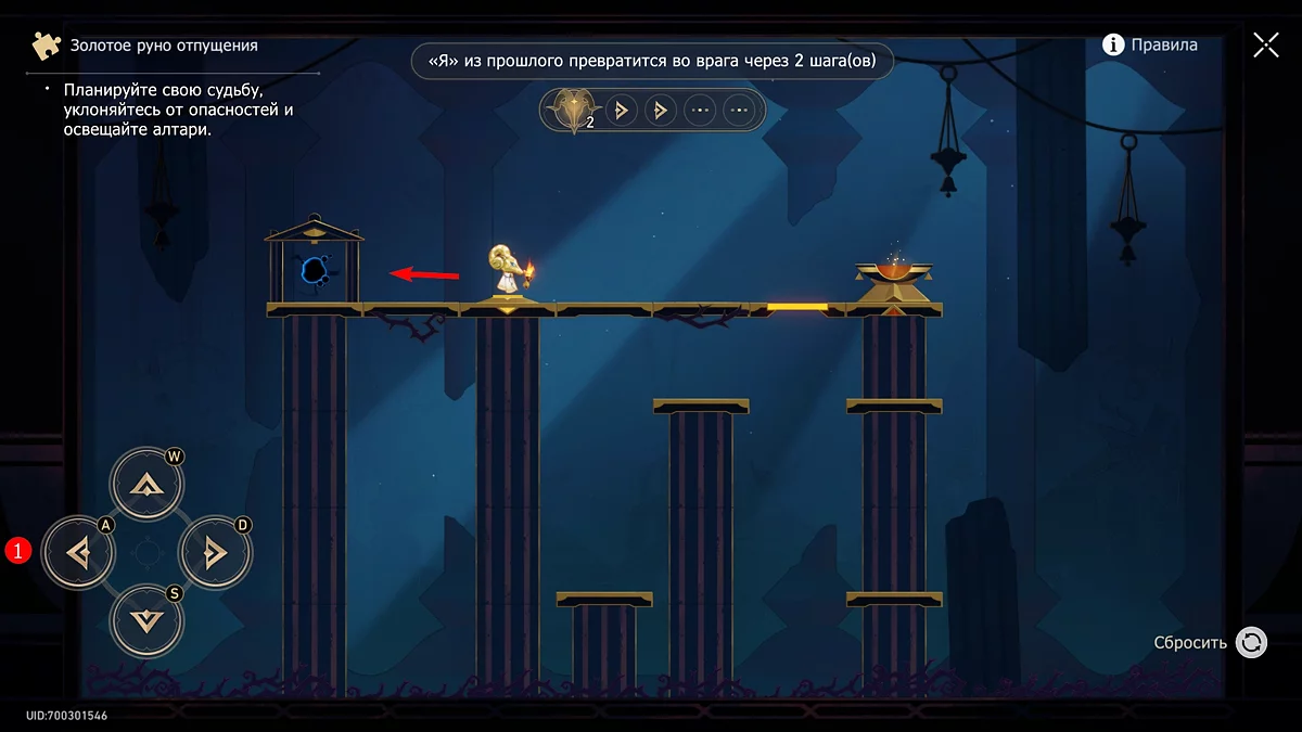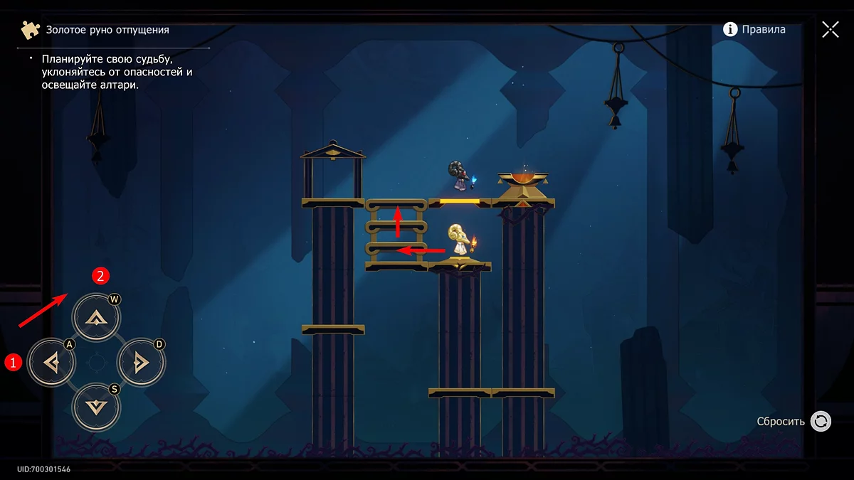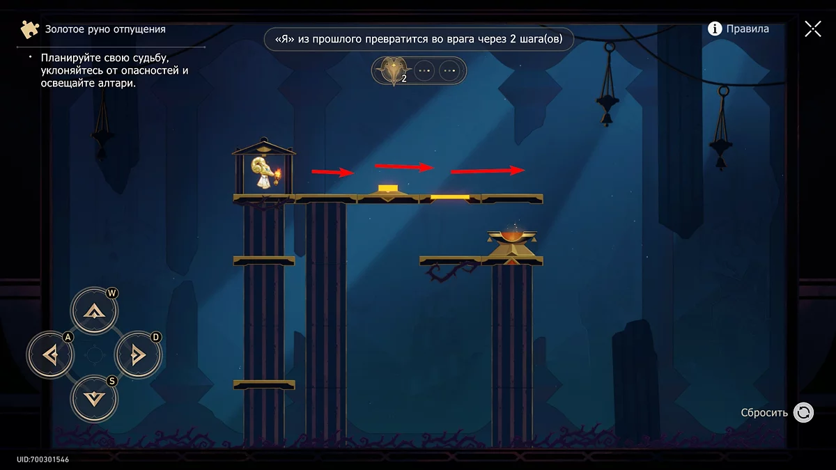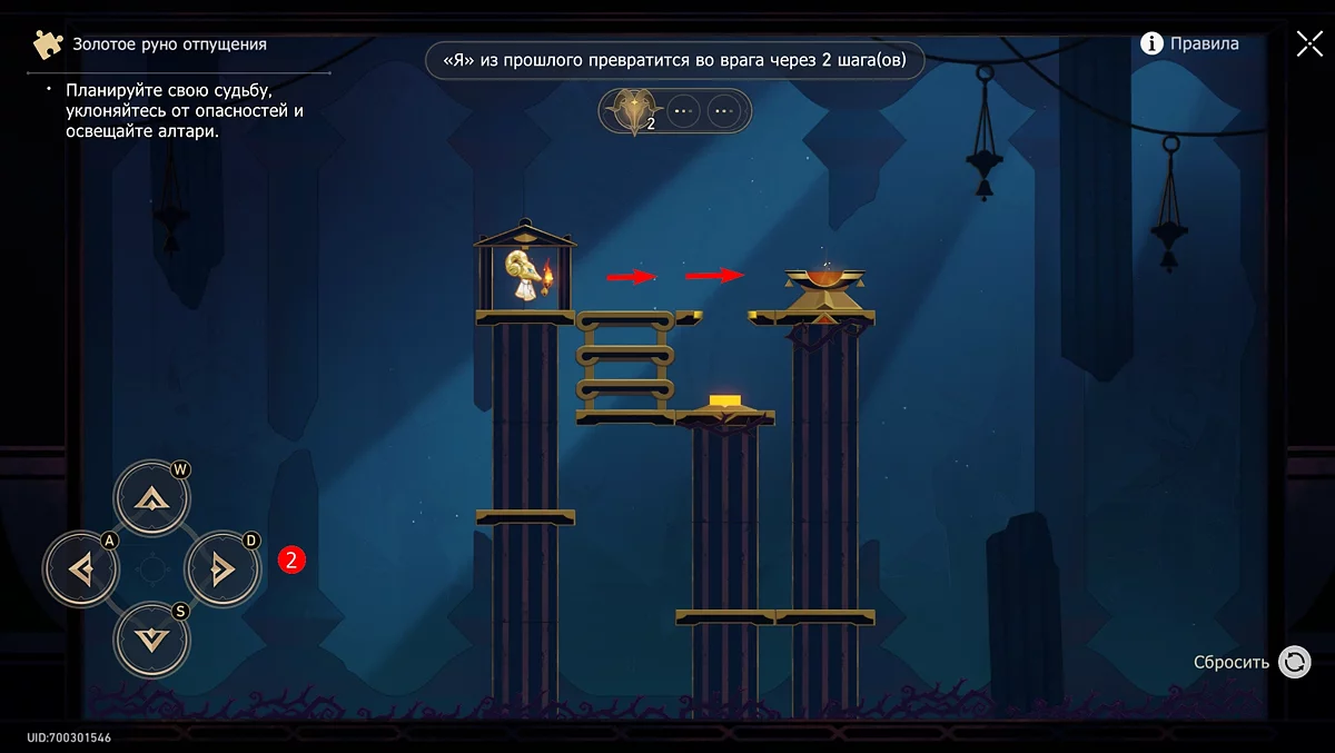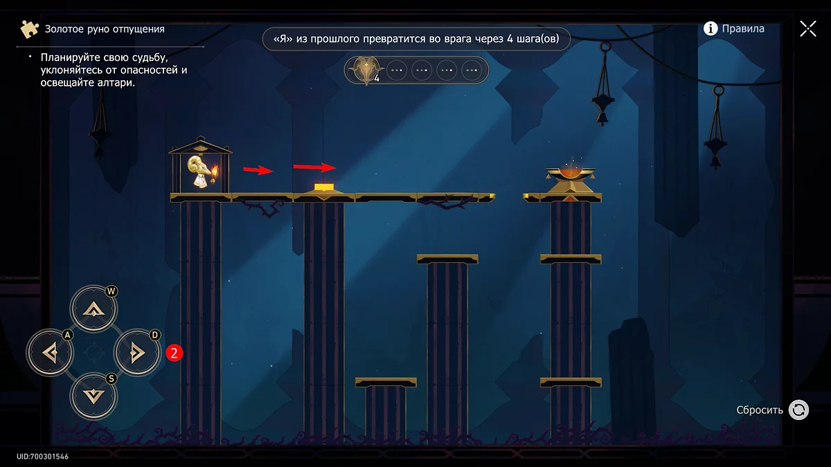 Пройдіть трохи вперед від попередньої скрині та увійдіть у приміщення, окутане паром. Пройдіть до протилежної стіни і побачите ще одну головоломку з бараньою головою. Щоб її вирішити, дотримуйтесь підказок на скріншотах. Стрілками вказано напрямок, у якому потрібно йти, а цифри біля клавіш вказують кількість кроків.