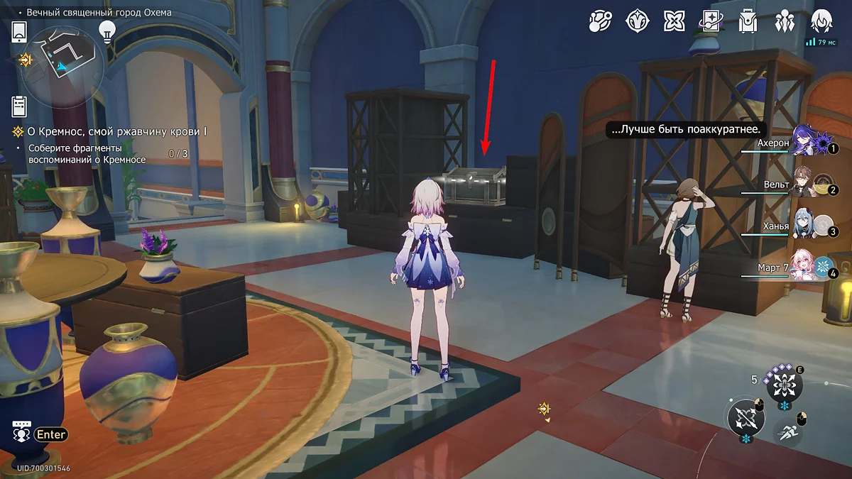 На галявині з геозаврами буде вхід до будівлі. Вирушайте туди, після чого поверніть праворуч. Навпроти статуї з пісочним годинником, між полицями стоятиме скриня.